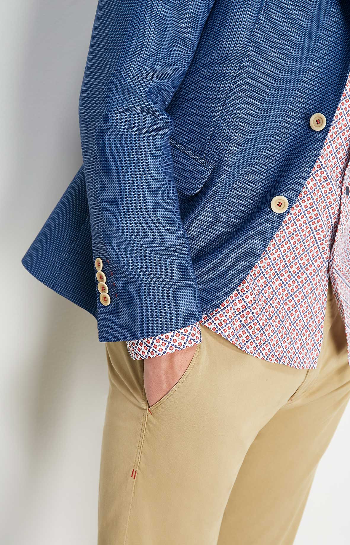Americana de la firma Florentino super ligera, con un micro dibujo en dos hilaturas de azul. Perfecta para un pantalón vaquero o medio vestir.