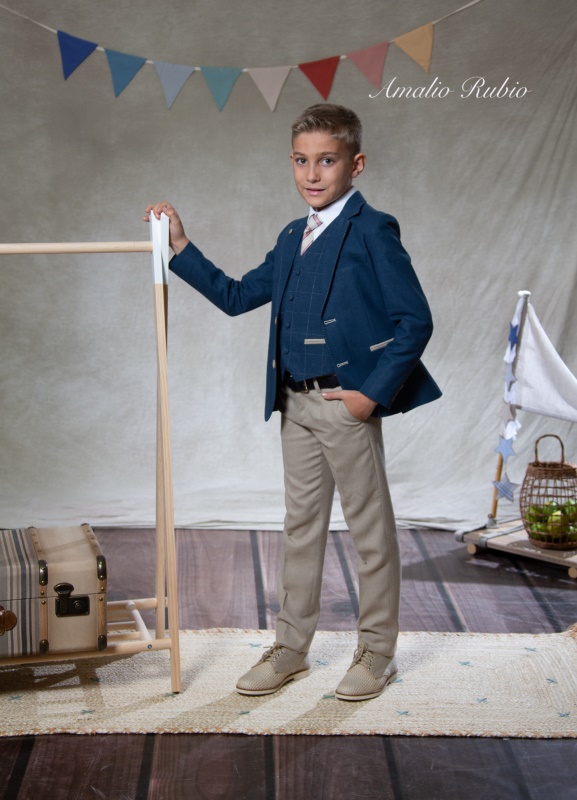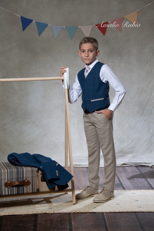 Traje de americana marinoy pantalon beige con chaleco de cuadros y corbata. Diseñado y fabricado en España.