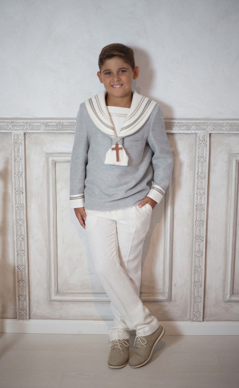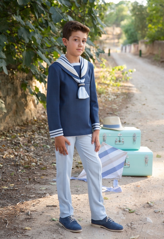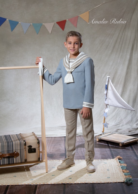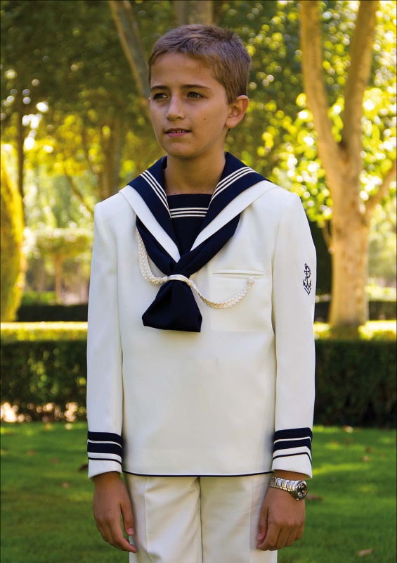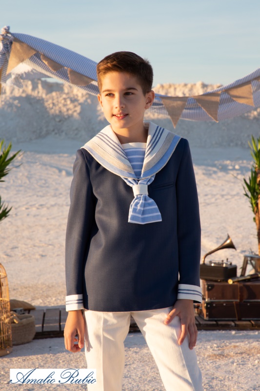 Conjunto de marinero en color crudo, confeccionado en crepe en marino y crudo. Un modelo muy dulce y clásico. De la firma de AMALIO RUBIO.