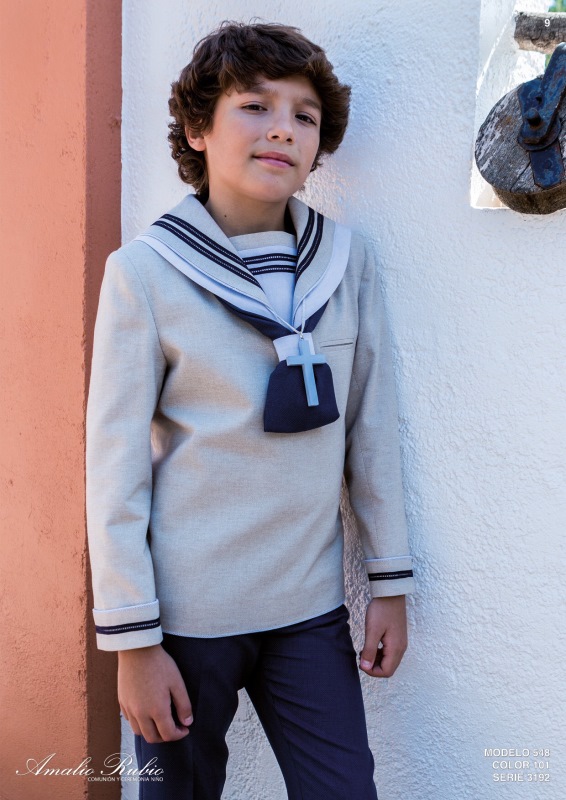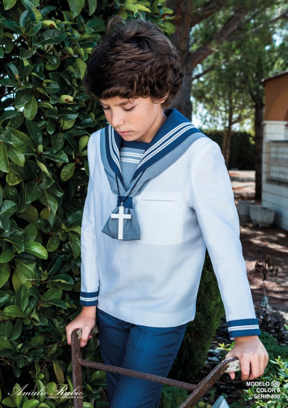 Bonito traje marinero de lino blanco, combinado con capelina en tonos azules. Un modelo ideal para hacer la comunión con elegancia y modernidad. De la firma de AMALIO RUBIO.