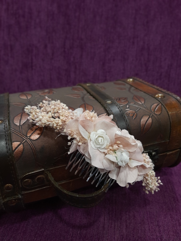 Peina de flores preservadas y paniculata. Posibilidad de modificar colores, modelo y materiales.