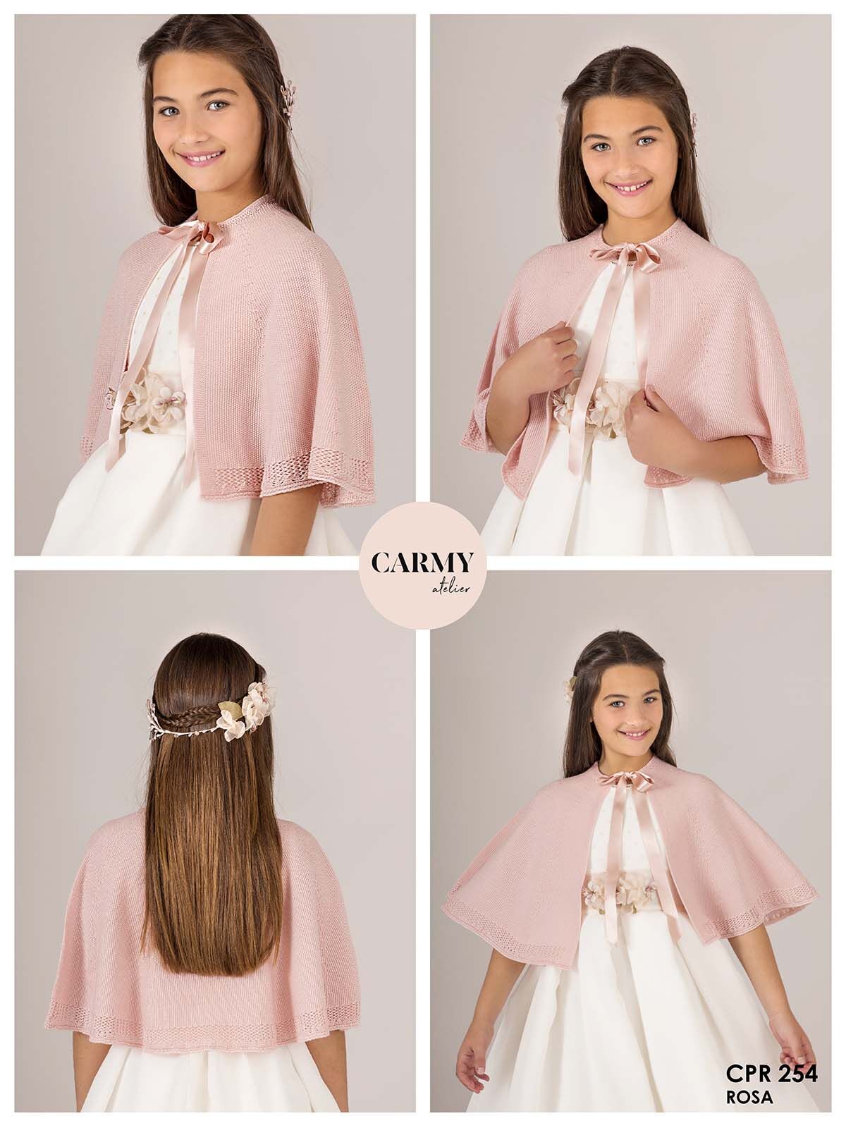 Sensacional capa de comunión confeccionada en punto. Capa sobre los hombros hasta la mitad del brazo y abrochada con unas tiras de raso. Un complemento ideal para acompañar a cualquier vestido. De la firma Española de CARMY.