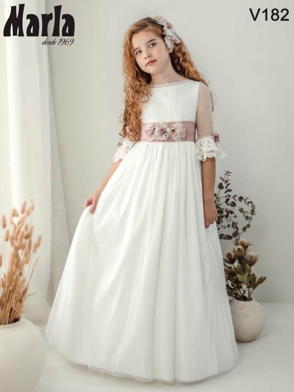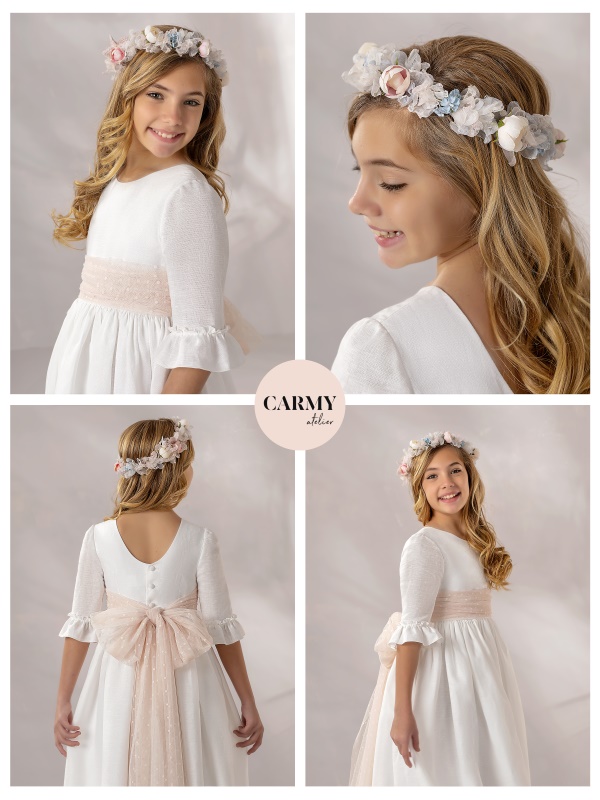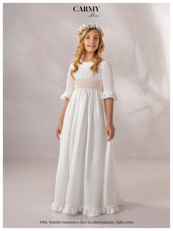 Sencillo vestido de comunión de estilo romántico, confeccionado en lino. Lleva unas bonitas mangas francesas con un volante, un fajín en color salmón y de tul, que le da mucha luz al vestido y en la terminación de la falda, un volante. Un modelo que se puede llevar con o sin cancan, para aquellas niñas que así lo deseen. De la firma de CARMY.