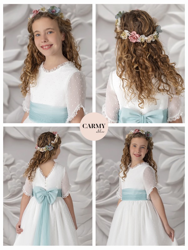 Espectacular vestido de comunión confeccionado en gasa de plumeti tanto el cuerpo como la falda. Lleva un escote redondo con puntilla y una espalda en forma de V toda abotonada, unas mangas cortas con puntilla y con una graciosa abertura lateral; la falda tiene vuelo con una cinta de encaje en su terminación y el fajín de tul en color liso con un lazo grande detrás. Un modelo clásico y refinado con el que nuestras princesas lucirán preciosas en su día de Comunión. De la firma de CARMY.