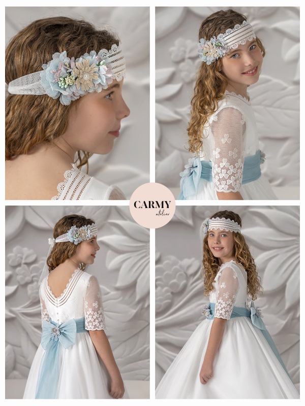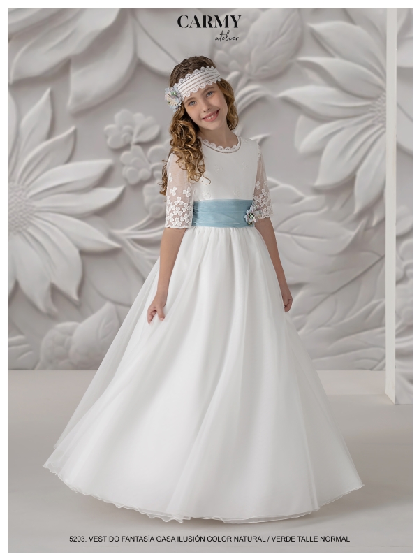 Espectacular vestido de comunión confeccionado en seda cristal. Lleva un escote redondo con un adorno de vainicas a su alrededor, la espalda en forma de V lo forman varias vainicas y una puntilla y su cuerpo, al igual que las mangas lo compone un tul bordado de tréboles. Un falda fruncida en la cintura y de capa y un fajín en color verde con un gran lazo. Un modelo clásico con toques modernos componen este asombroso vestido, con el que nuestras princesas lucirán preciosas en el día de su Comunión. De la firma de CARMY.