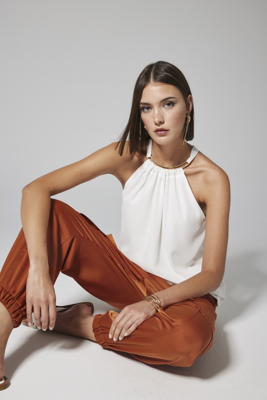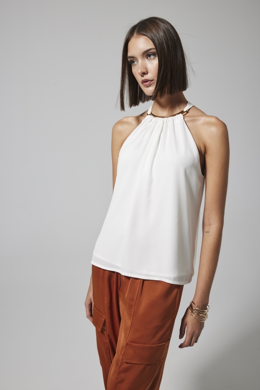 Bonita blusa de fiesta confeccionada en gasa. Lleva un original escote halter con un adorno en color dorado y atado en la espalda. Un modelo para combinar con cualquier falda o pantalón. De la fierma de J. ARGGIDO.