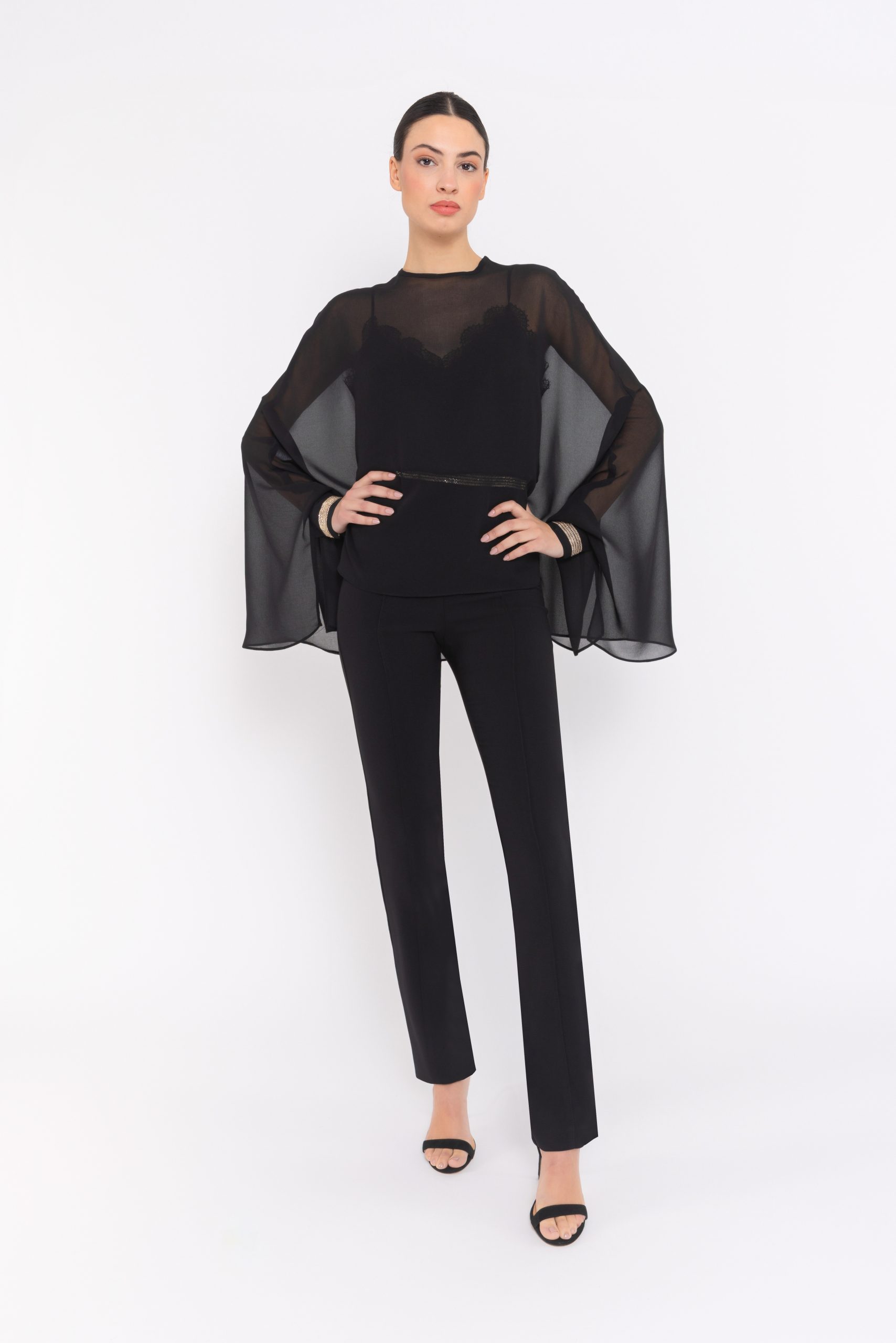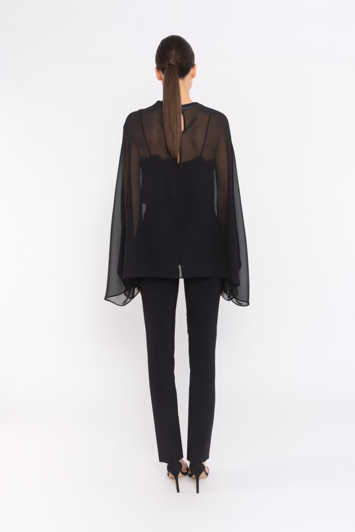 Asombrosa capa de fiesta confeccionada en gasa. Lleva un escote redondo, una espalda abierta con un corchete y unos puños con billos en la terminación de los laterales. Un modelo sencillo y elegante para acompañas, como complemento, a cualquier vestido o mono. De la la fima Española de CARLA RUIZ.