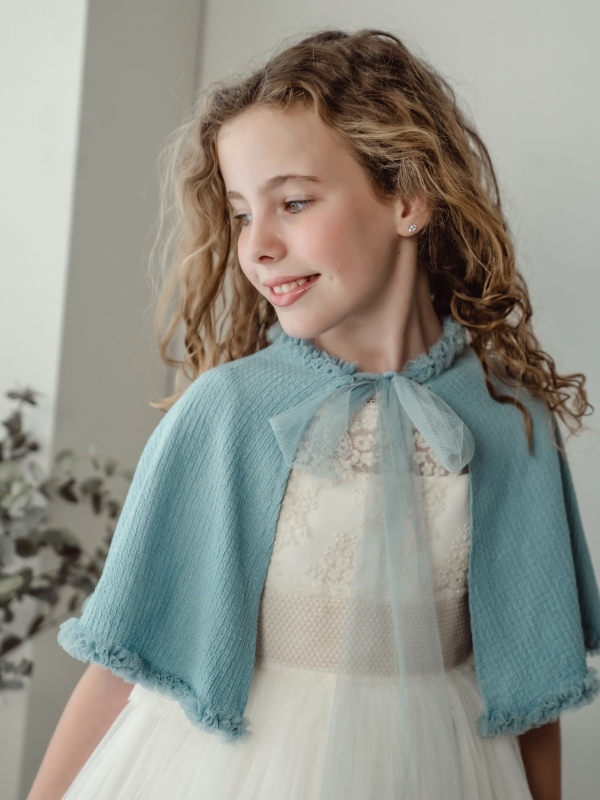 Sensacional capa de comunión confeccionada en punto. Bonita prenda de vestir que cubre los hombros y tiene un lazo de cristal que se ata en el cuello. Un modelo sencillo y estiloso que acompaña como complemento a cualquier vestido de comunión dándole elegancia a la prenda. De la firma de MARLA.