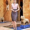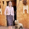 Bonito y elegante conjunto de vestido de tul bordado con lentejuelas, simulando flecos; y una chaqueta en color liso, ribeteada con un vivo en color negro. De la firma de Sonia Peña.