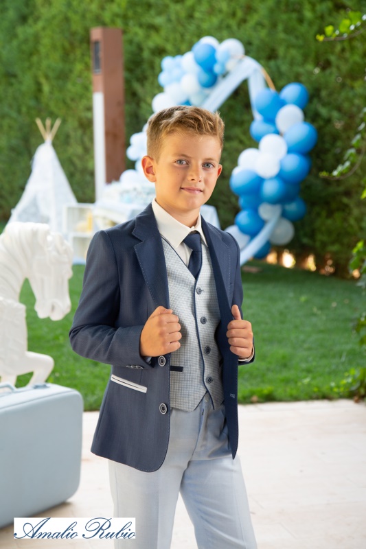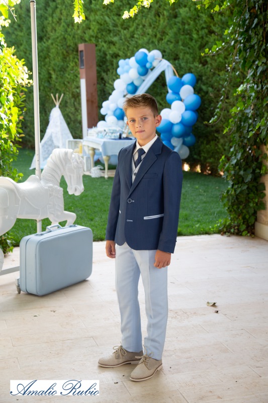Conjunto americana azul noche, pantalón celeste, chaleco, corbata y pañuelo.