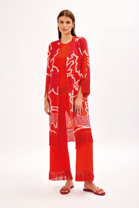Sensacional conjunto de tres piezas de pantalón, confeccionado en gasa. Lleva una blusa de sisas, un pantalón tobillero y un cardigan estampado. Un modelo que va acompañado de flecos en todo el conjunto. Ideal para cualquier evento. De la firma de J.ARGGIDO.