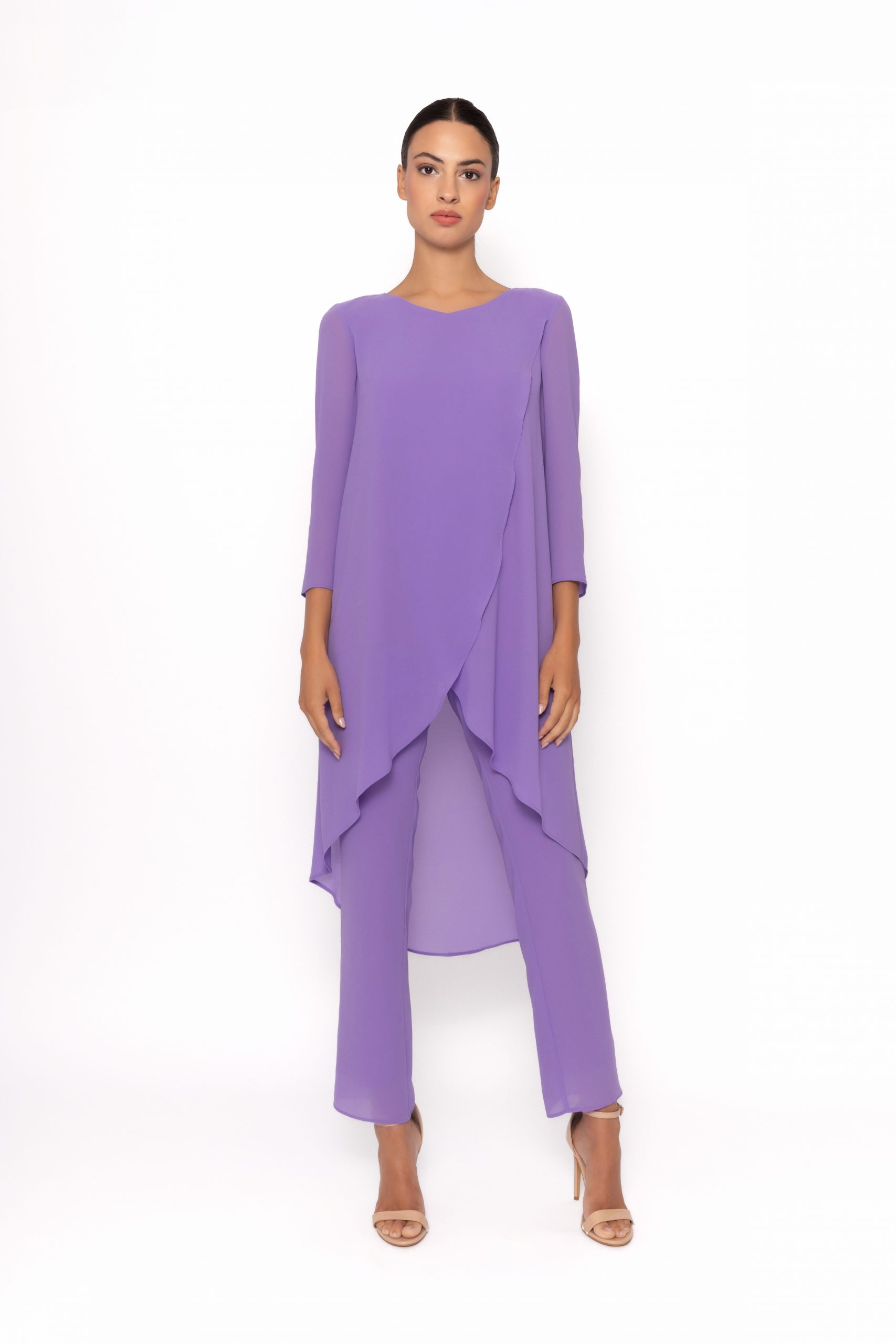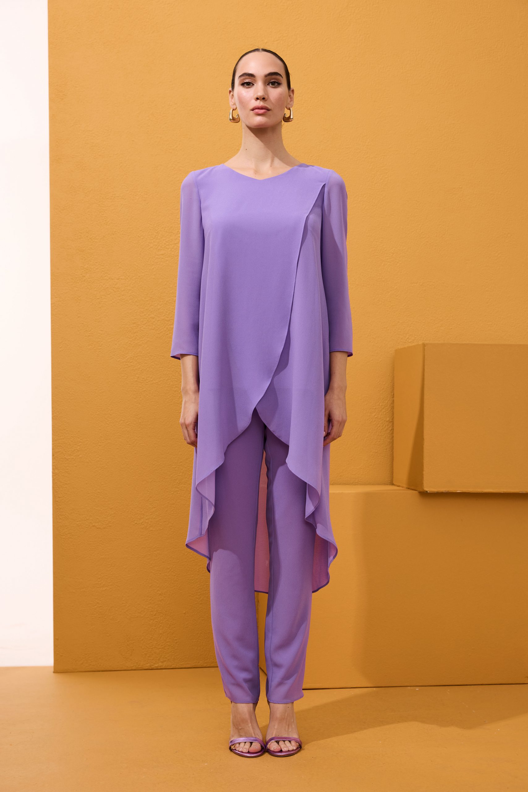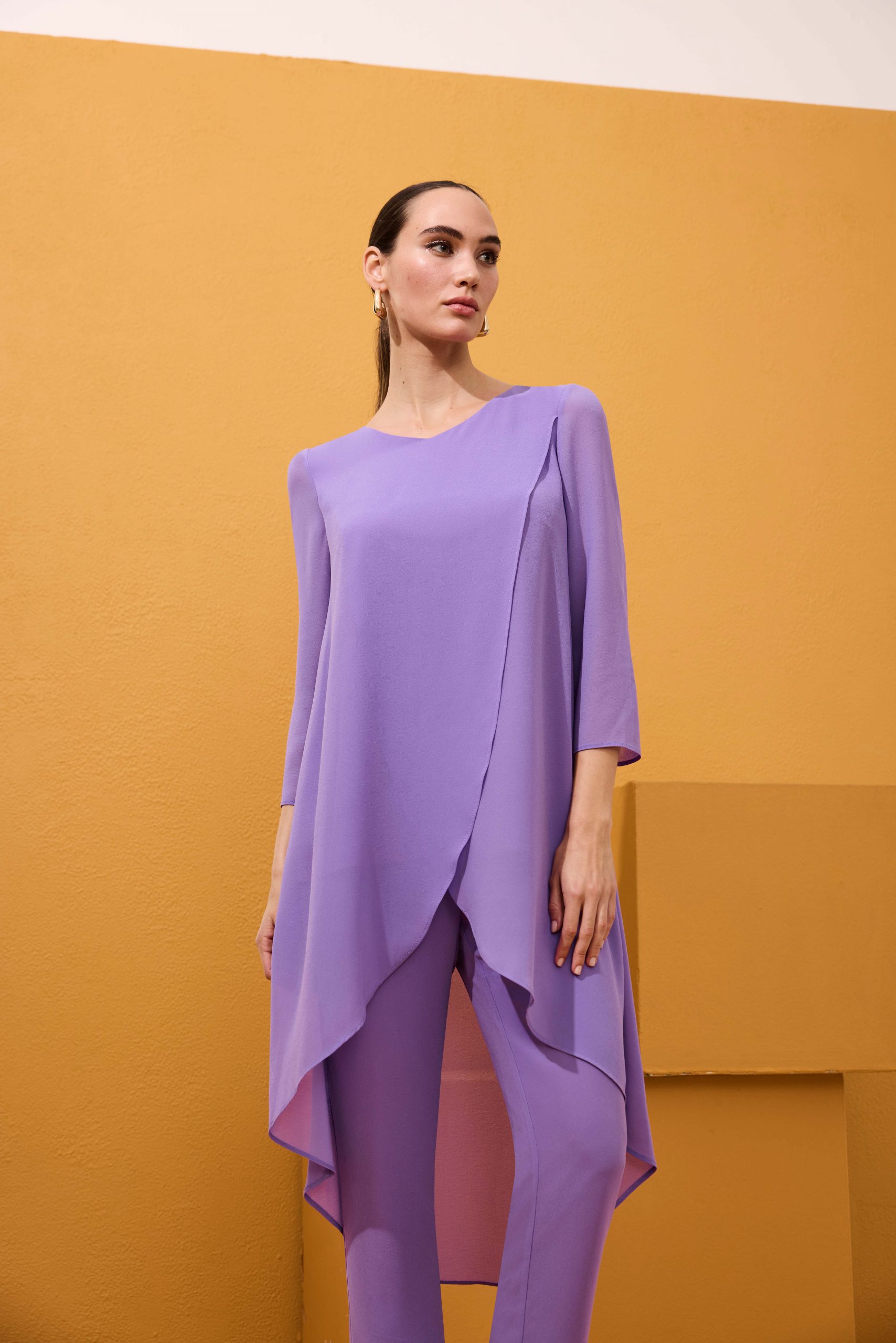 Fantástico conjunto de dos piezas de pantalón y blusón de fiesta confeccionado en gasa. Lleva un blusón asimétrico, más corto delante que detrás, cruzado por delante y abrochado con un botón en la espalda. Su pantalón es recto de pitillo. Un modelo sencillo y elegante para ir cómoda y original en el día de tu evento. De la firma Española ARGGIDO.
