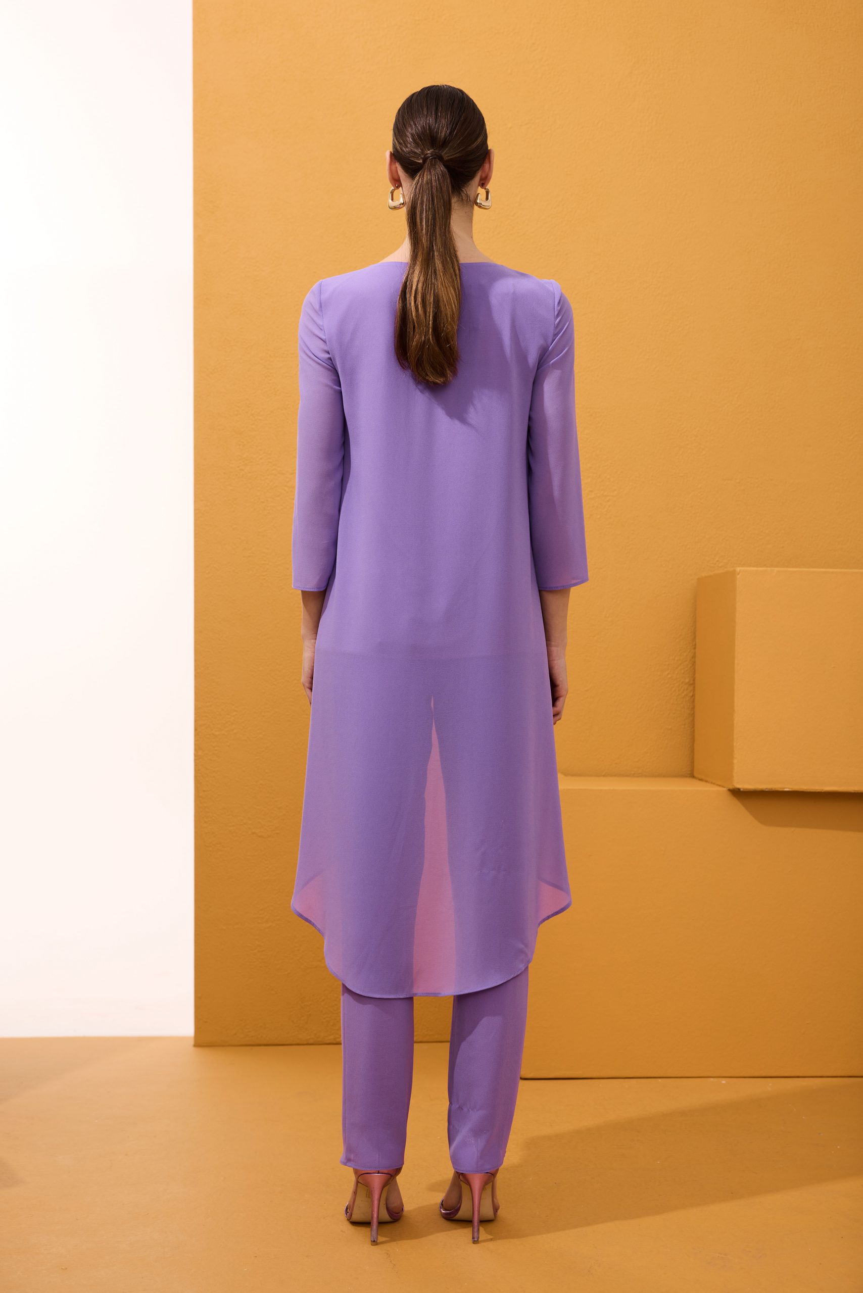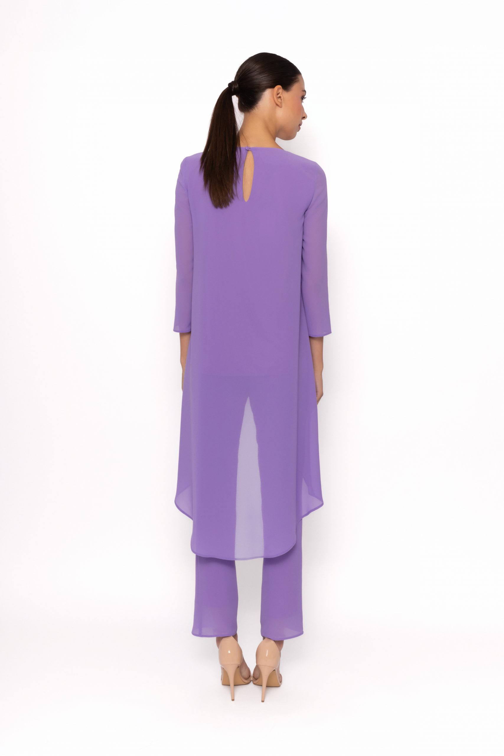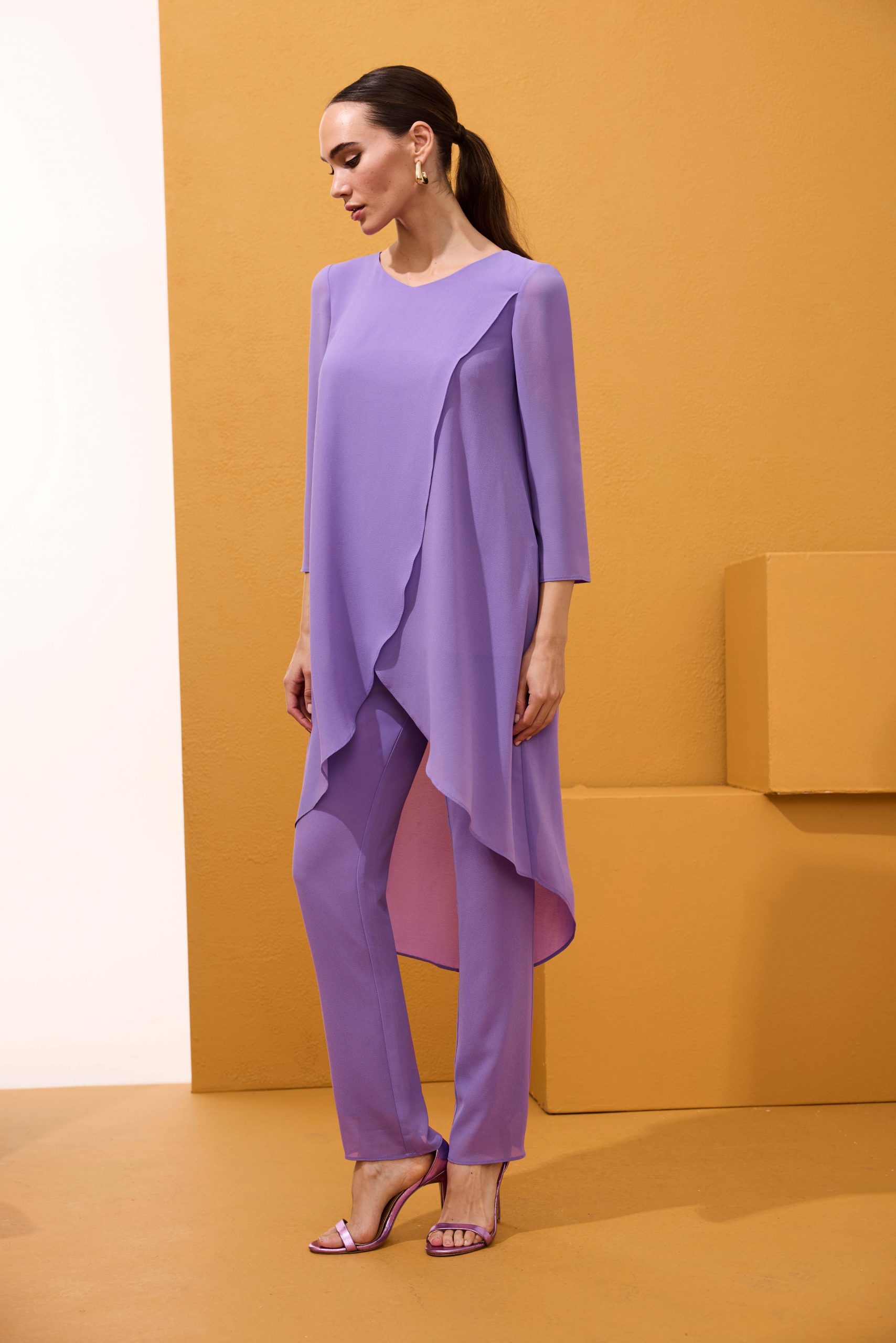 Fantástico conjunto de dos piezas de pantalón y blusón de fiesta confeccionado en gasa. Lleva un blusón asimétrico, más corto delante que detrás, cruzado por delante y abrochado con un botón en la espalda. Su pantalón es recto de pitillo. Un modelo sencillo y elegante para ir cómoda y original en el día de tu evento. De la firma Española ARGGIDO.