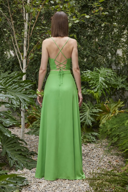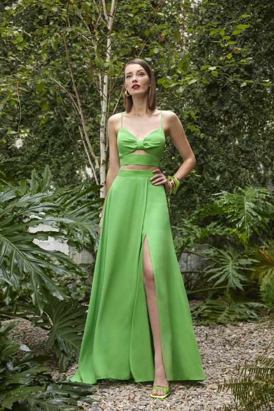 Fantástico conjunto largo de fiesta confeccionado en crepé. Se compone de un top escotado con tirantes finos y un nudo original en el centro del pecho y una falda larga con vuelo y con una abertura lateral. Un modelo muy juvenil y moderno para cualquier fiesta o graduación. De la firma de CARLA RUIZ.