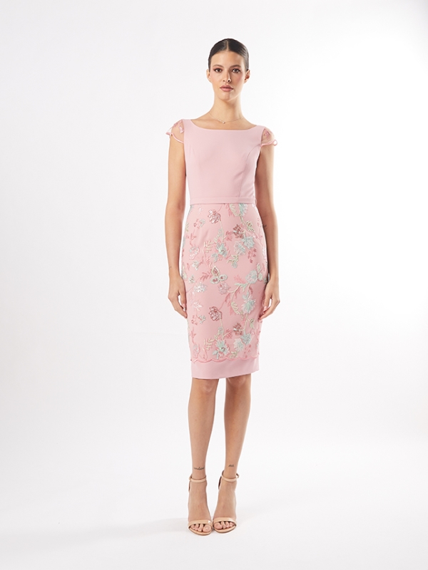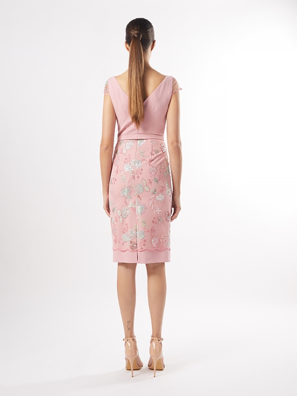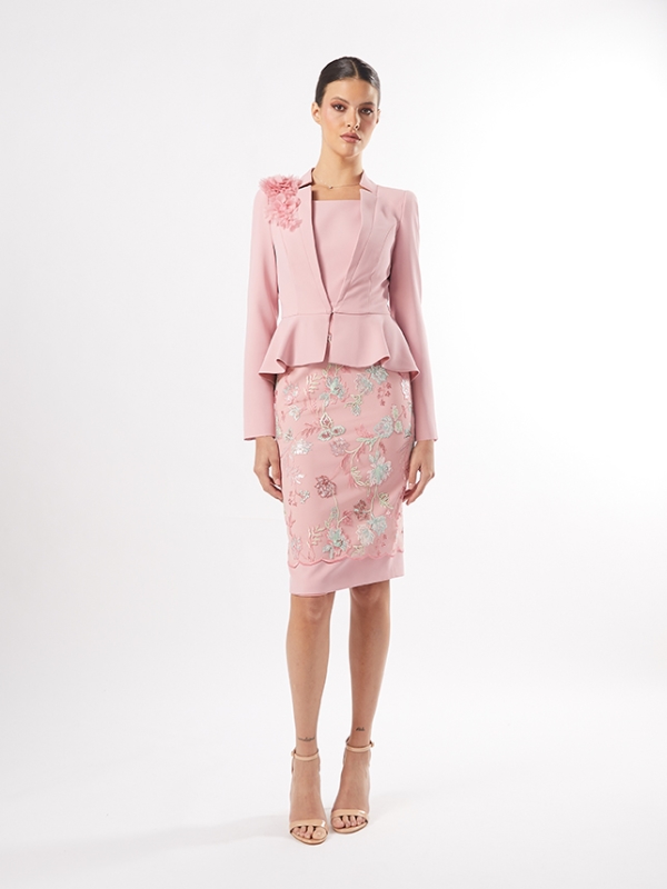 Elegante conjunto de madrina de vestido y chaqueta, confeccionado en crepé y encaje bordado. Lleva una chaqueta entallada con peplum en la cintura y una flor en la solapa. El vestido lleva el cuerpo en crepé y unas mangas cortas y una falda de líneas rectas de encaje bordado.Un modelo que brilla por su elegancia y estilo. De la firma de CARLA RUIZ.