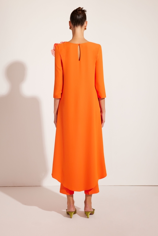 Sensacional conjunto de pantalón de fiesta confeccionado en gasa. Lleva un escote a la caja, una espalda cerrada con una lágrima y unas mangas francesas. Su blusón asimétrico es más corto de delante que de detrás y el pantalón recto de corsario. Un modelo estiloso y moderno con el que irás fantástica a cualquier boda, comunión o evento. De la firma española de CARLA RUIZ.