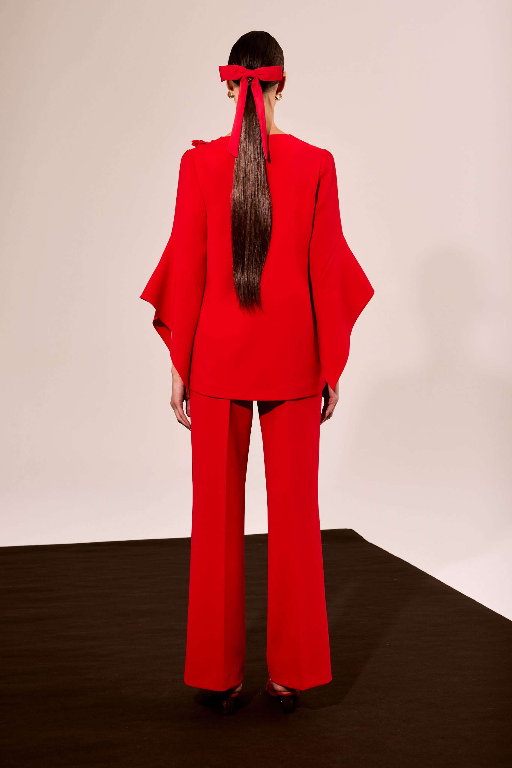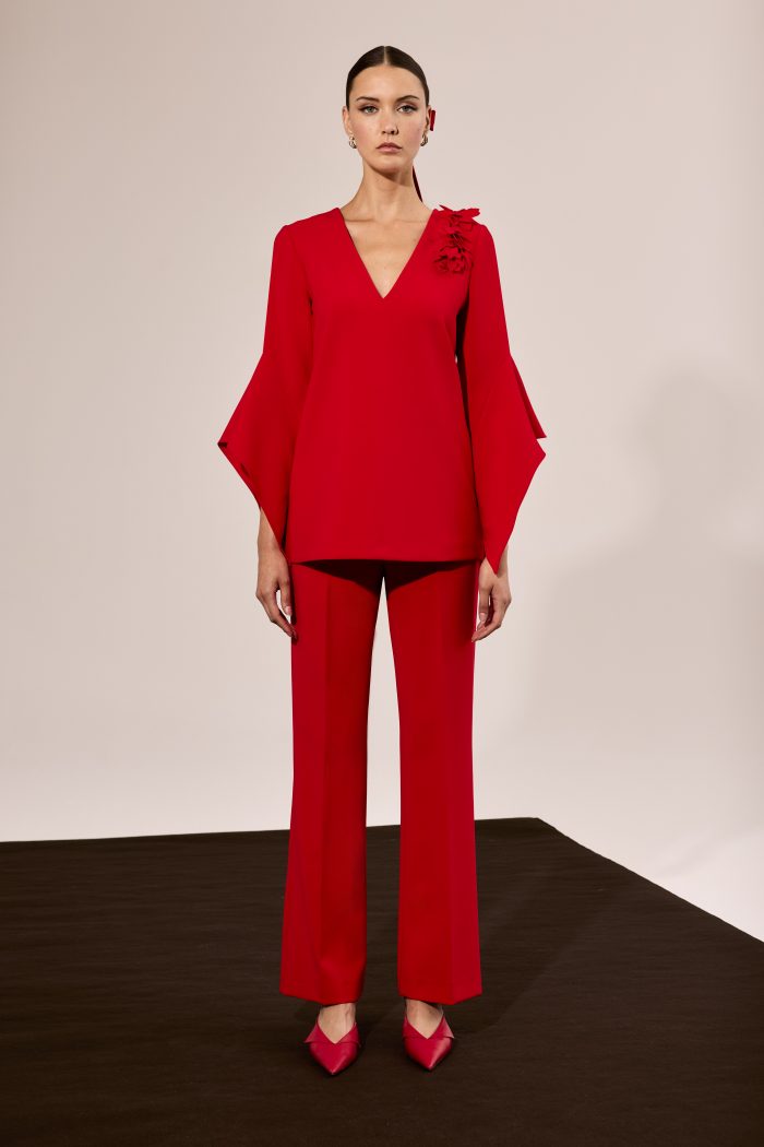 Sensacional conjunto de pantalón de fiesta confeccionado en crepé. La blusa lleva un escote de pico, una espalda cerrada y unas mangas francesas con un volante abierto en su terminación. Su pantalón es recto con una cremallera lateral. Lo acompaña unas flores del mismo tejido para ponerlas en el hombro. Un modelo sencillo y estiloso con el que te sentirás muy cómoda el día de tu fiesta. De la firma Española de CARLA RUIZ.