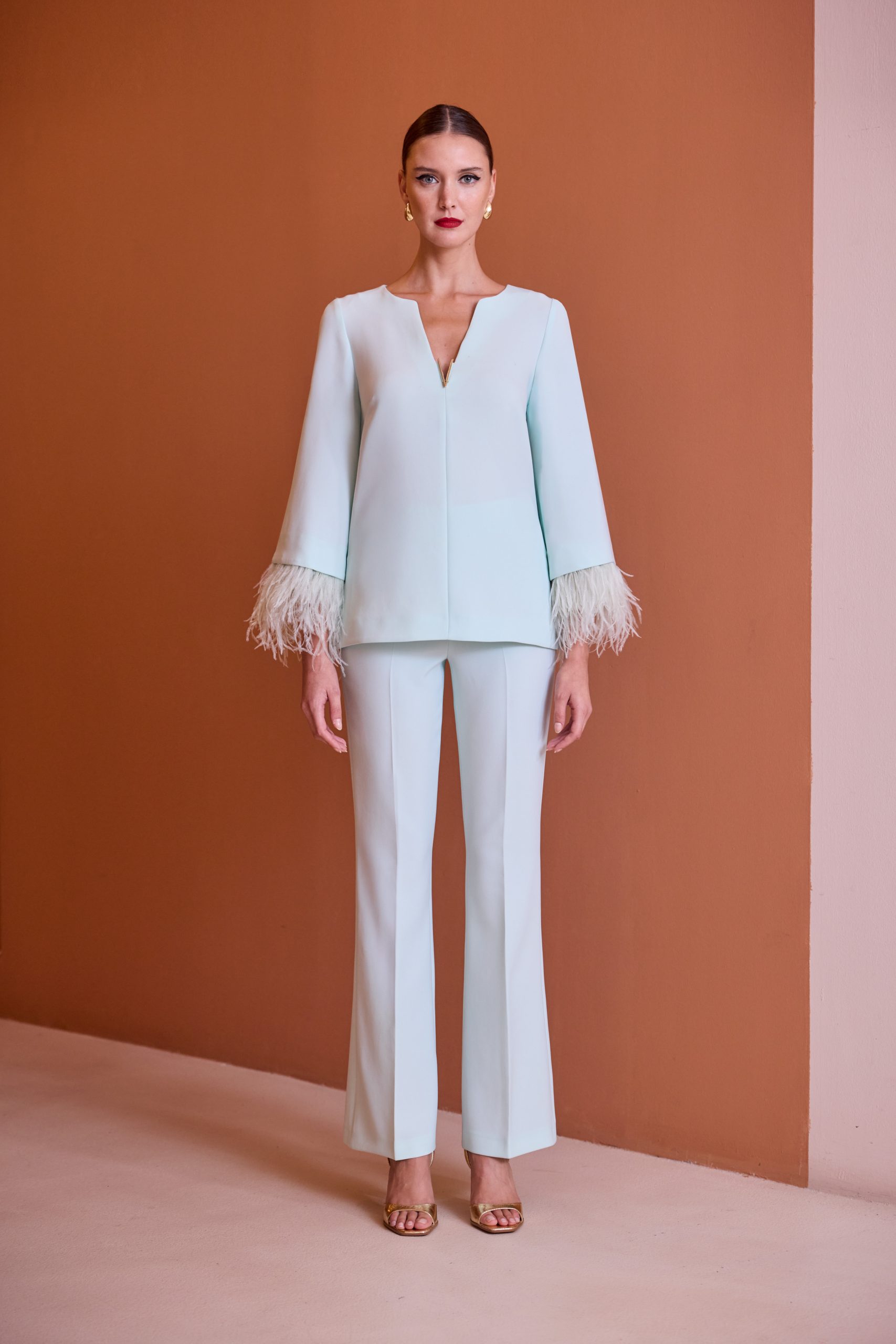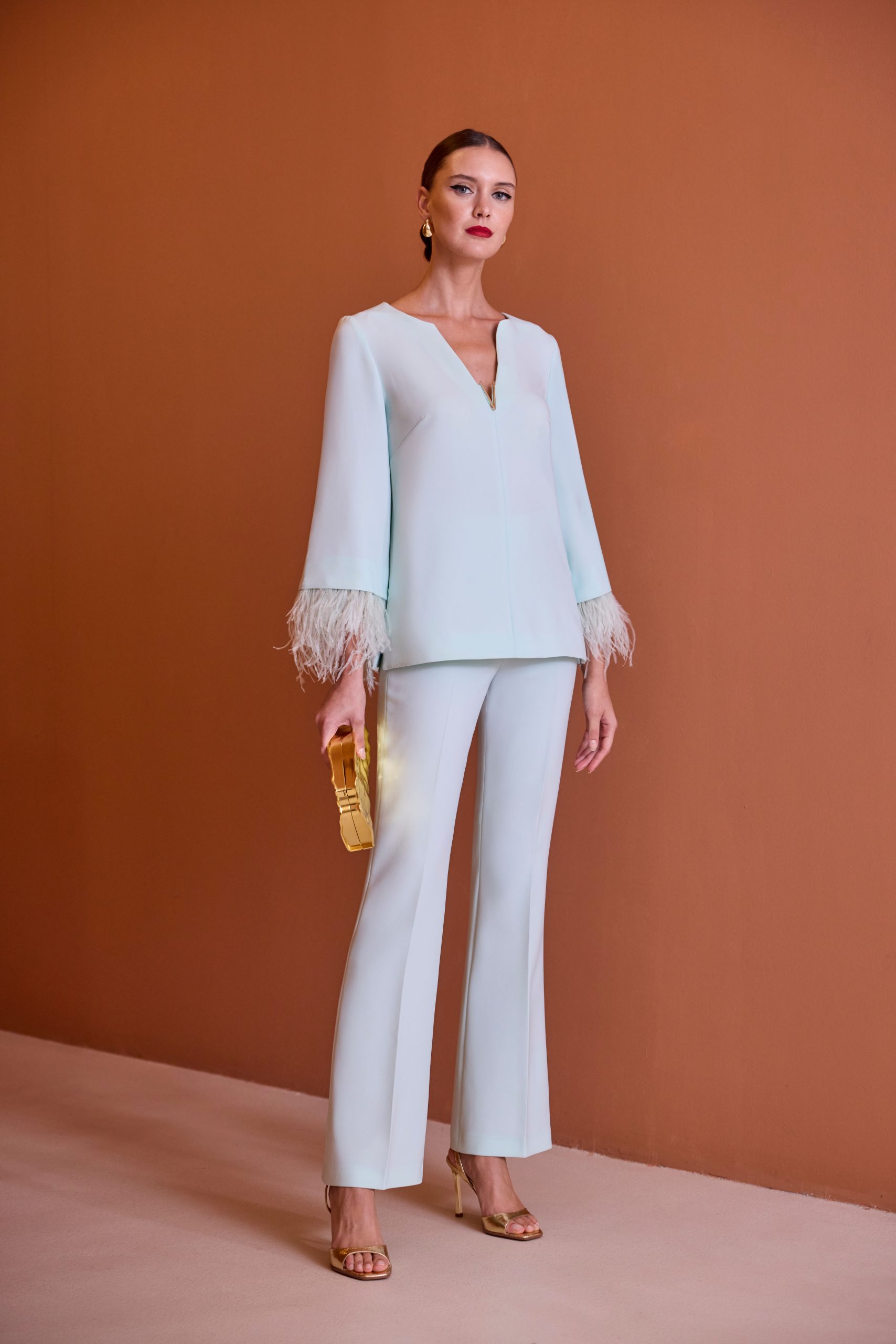 Sensacional conjunto de blusón y pantalón de fiesta confeccionado en crepé. Lleva un blusón con forma de evasé, con el escote de pico con un detalle dorado y unas mangas acampanadas con plumas desmontables, en su terminación. Su pantalón es recto con un poco de forma en el bajo. Un modelo lleno de encanto y estilo con el que destacarás en bodas, comuniones o cualquier evento que tengas. De la firma Española CARLA RUIZ.