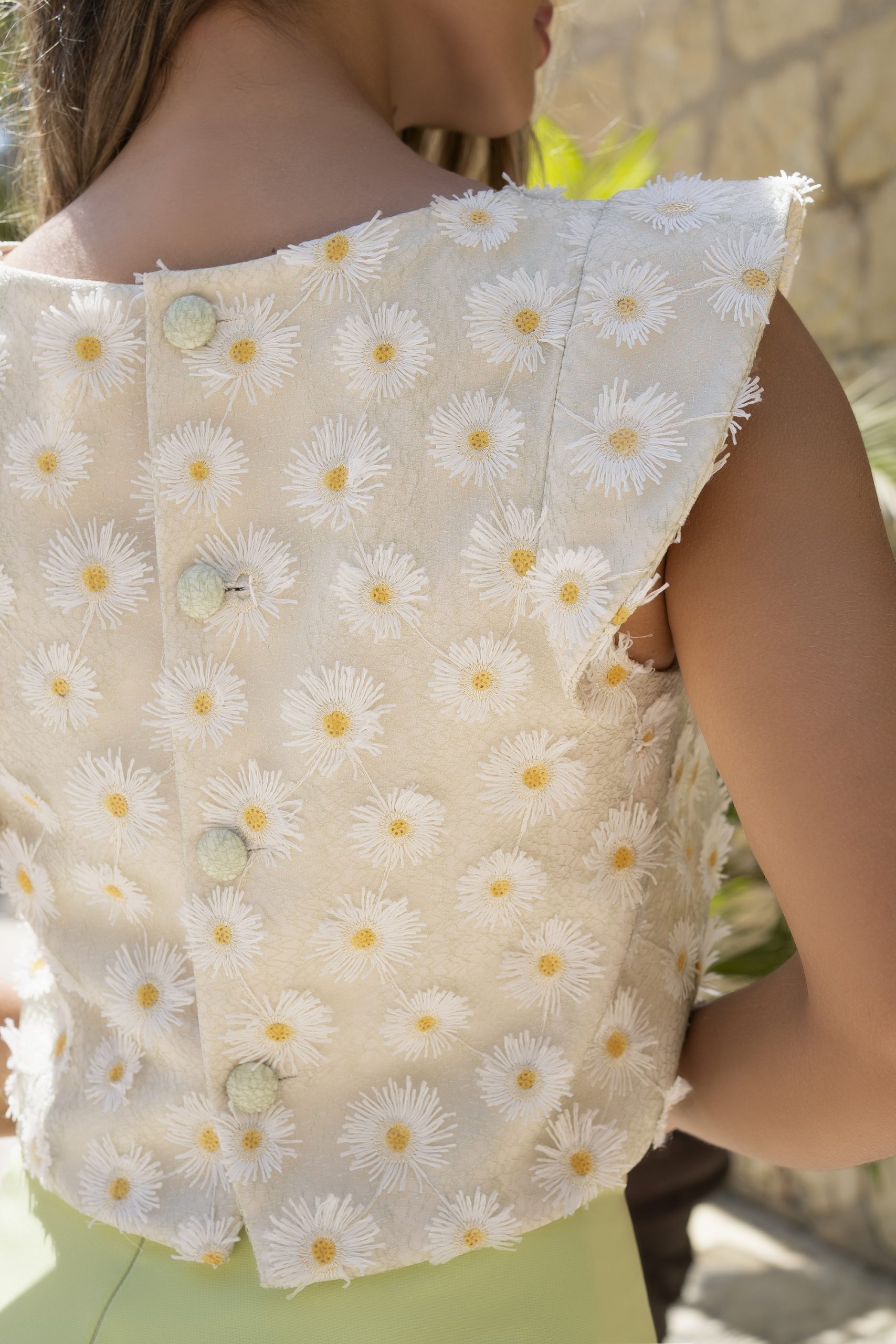 Asombroso conjunto de fiesta de falda y blusa confeccionado en crepé y tul bordado de margaritas. La blusa lleva un escote a la caja, mangas de sisas con volante y espalda cerrada con botones. Su falda estallada tiene una abertura en un lateral de la falda. Un modelo elegante y distinguido con el que darás en tu fiesta un toque de diversión y color. De la firma Española SILVIA NAVARRO.
