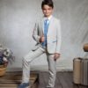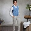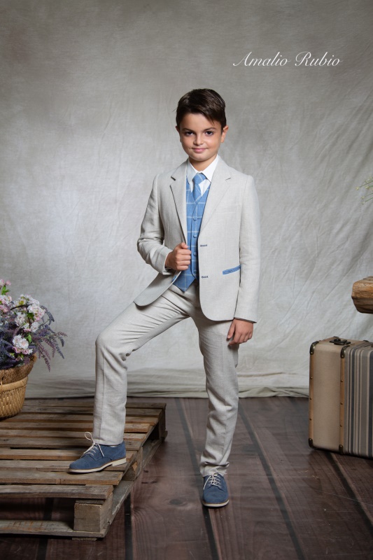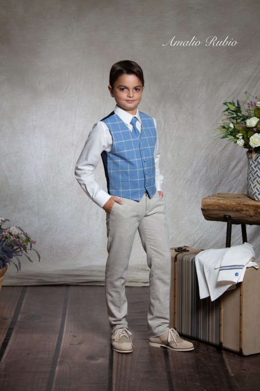 Traje de americana entallada y pantalon pitillo en tostado con chaleco y corbata de cuadros.