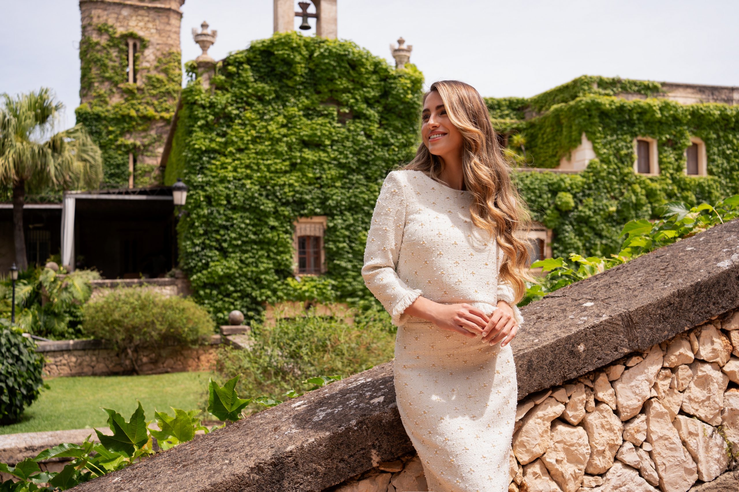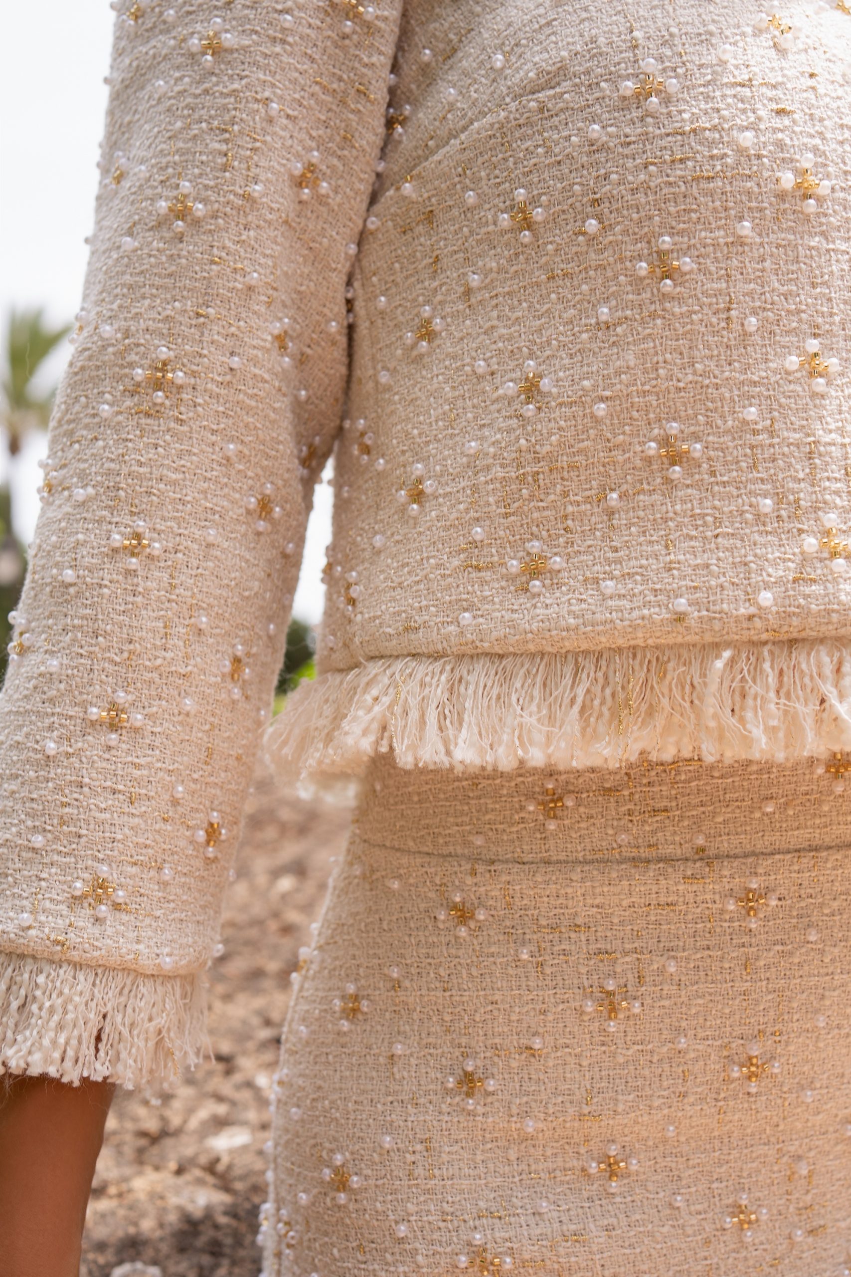 Deslumbrante conjunto de falda y blusa confeccionado en channel. Lleva un escote de cuello a la caja, una espalda abotonada, unas mangas francesas y unos flecos del mismo tejido por todo el bajo de la blusa y las mangas. Su falda es entubada con una abertura por detrás. Además el tejido lleva unos abalorios por todo el conjunto; un modelo estiloso y muy elegante con el que destacarás en cualquier fiesta. De la firma Española SILVIA NAVARRO.