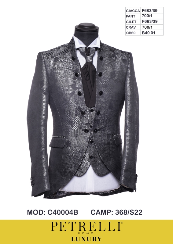Conjunto estámpado de 4 piezas, americana de botones plata-negro con hilo lurex, chaleco y corbatón coordinados en los tonos y pantalón liso negro.