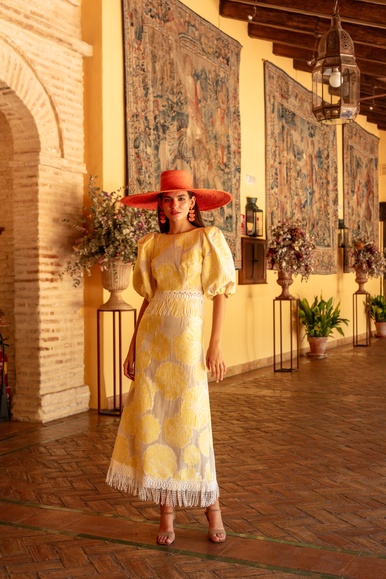 Espectacular conjunto de dos piezas de fiesta confeccionado en brocado de damasco. Lleva un cuerpo con el escote a la caja, unas mangas abullonadas y una espalda abotonada. Su falda es recta con una abertura en la parte detrás. Tanto el cuerpo como la falda tienen en su terminación una cinta de algodón con flecos. Un modelo lleno de encanto y elegancia para ir perfecta a cualquier boda, comunión o evento que tengas. De la firma Española MATILDE CANO.