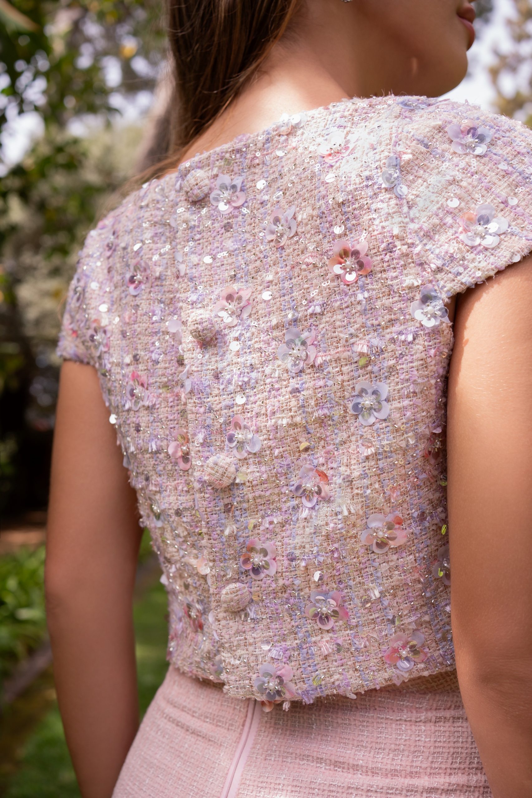Sensacional conjunto de dos piezas de falda y blusa de fiesta confeccionado en tweed, de corte channel. Lleva una blusa en tweed de lujo con motivos florales con el cuello a la caja y una espalda abotonada. Tiene una falda de tweed liso entallada con una abertura detrás. Un modelo lleno de encanto, elegancia y estiloso con el que deslumbrar en un día de comunión, boda o evento. De la firma Española SILVIA NAVARRO.