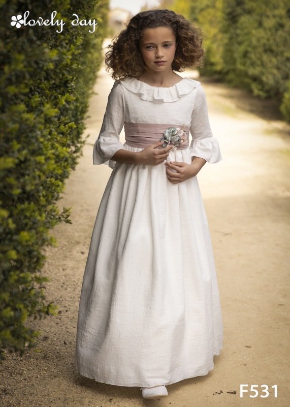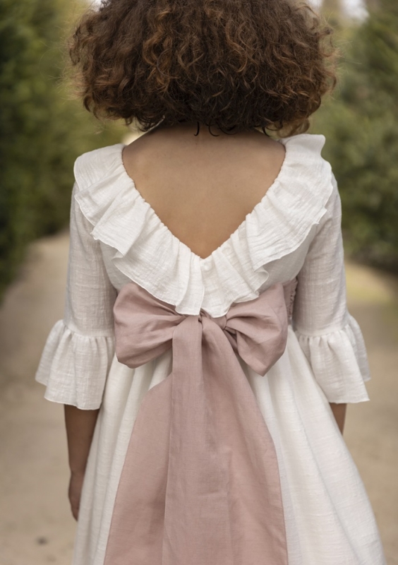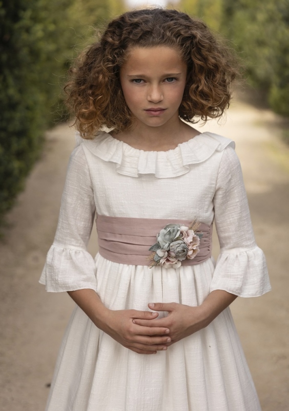 Asombroso vestido de comunión confeccionado en tejido rústico. Lleva un volante ancho sobre un cuello redondo y una espalda en forma de V. Su fajín de lino en color rosa nude, da un toque de color al vestido de estilo romántico. Un modelo lleno de elegancia y sencillez para que nuestras princesas disfruten de su día especial. De la firma de LOVELY DAY.