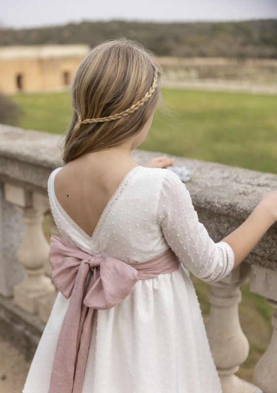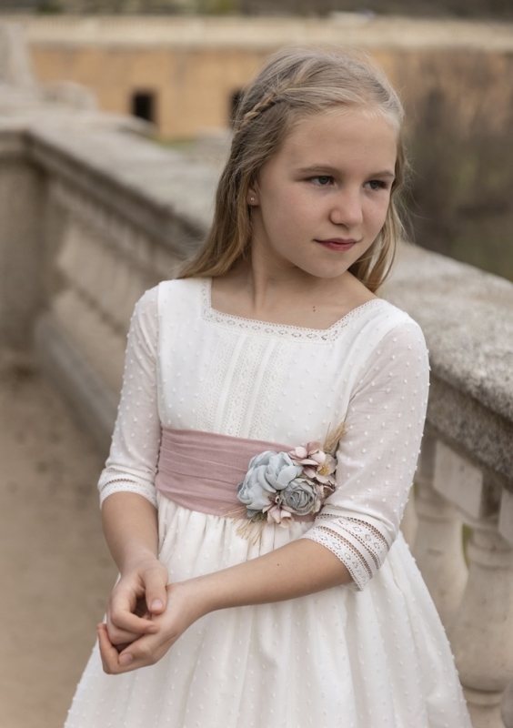 Sensacional vestido de comunión de corte romántico confeccionado en batista de plumeti. Lleva unos bonitos entredós de puntilla en el cuerpo y en la terminación de la manga francesa. Tiene el cuello cuadrado y la espalda en forma de V. Su fajín en lino de color rosa con flores crea un modelo delicado y elegante, para aquellas princesas finas y bonitas. De la firma de LOVELY DAY.