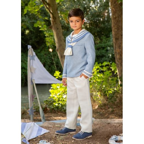 Conjunto de marinero en color crudo, confeccionado en crepe en marino y crudo. Un modelo muy dulce y clásico. De la firma de AMALIO RUBIO.