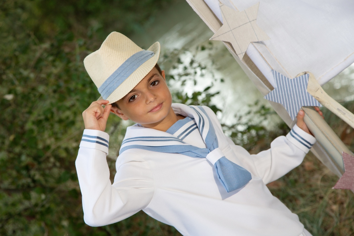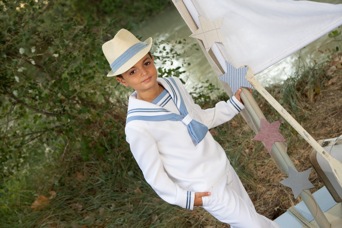 Marinero blanco con pecherín celeste de la firma Amalio Rubio. Lo confeccionamos en cualquier talla y con la modificaciones necesarias.
