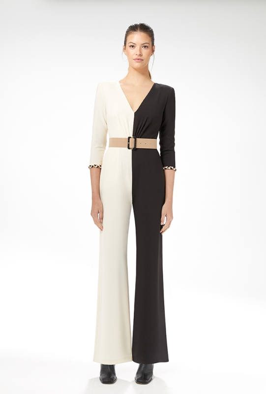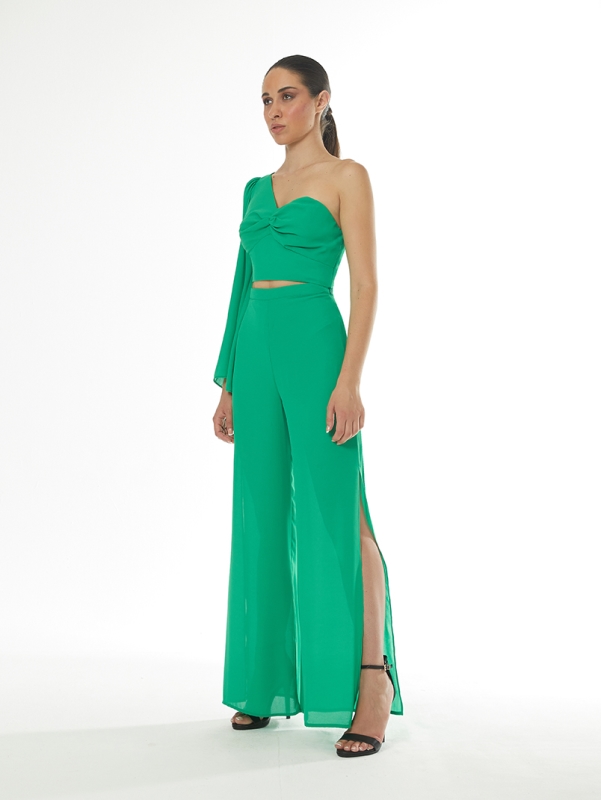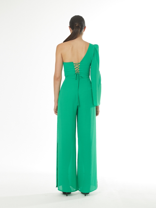 Sensacional mono de fiesta confeccionado en gasa. Lleva una manga larga y otra de palabra de honor con escote de corazón, con tiras cruzadas en la espalda y el pantalón tiene aberturas laterales. Un modelo juvenil y divertido con el que disfrutarás en cualquier evento que tengas. De la firma de J. ARGGIDO.