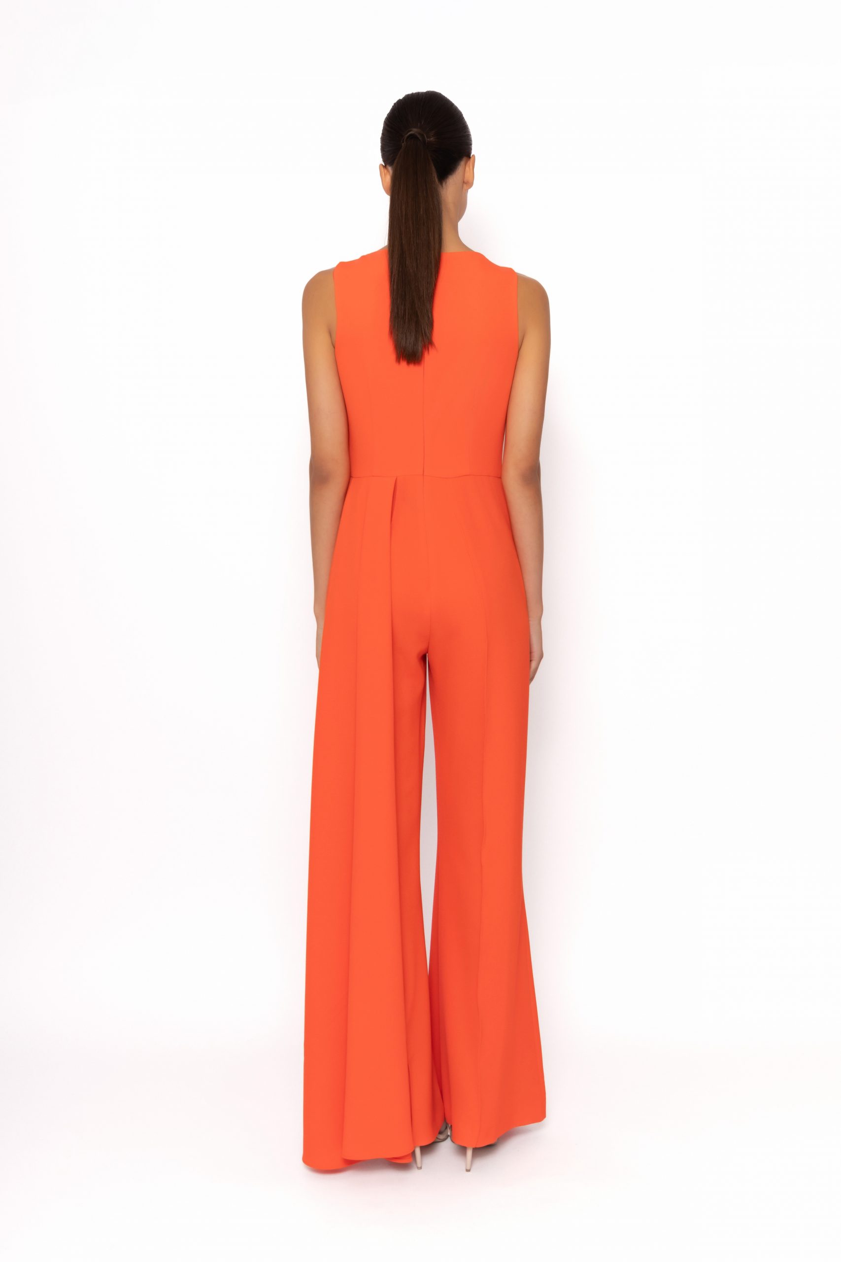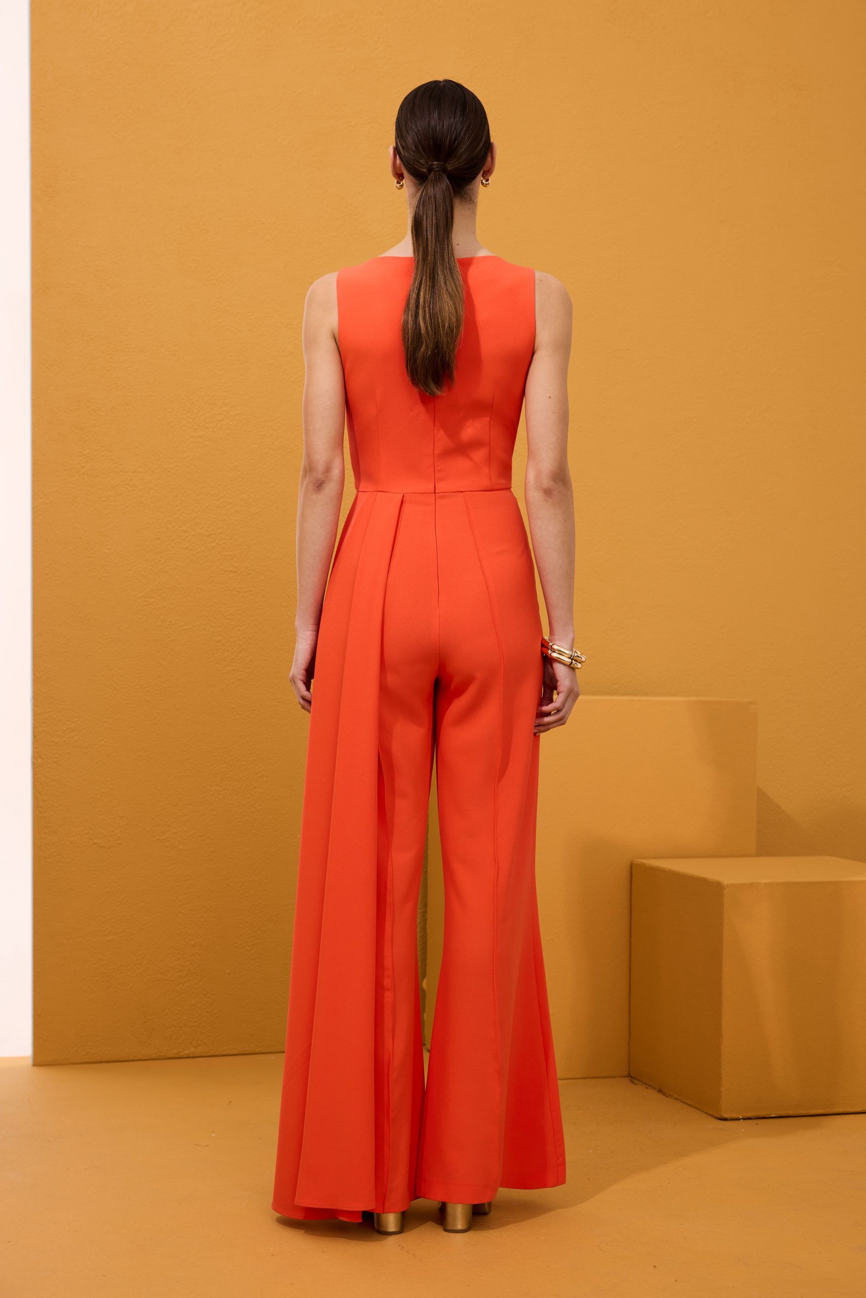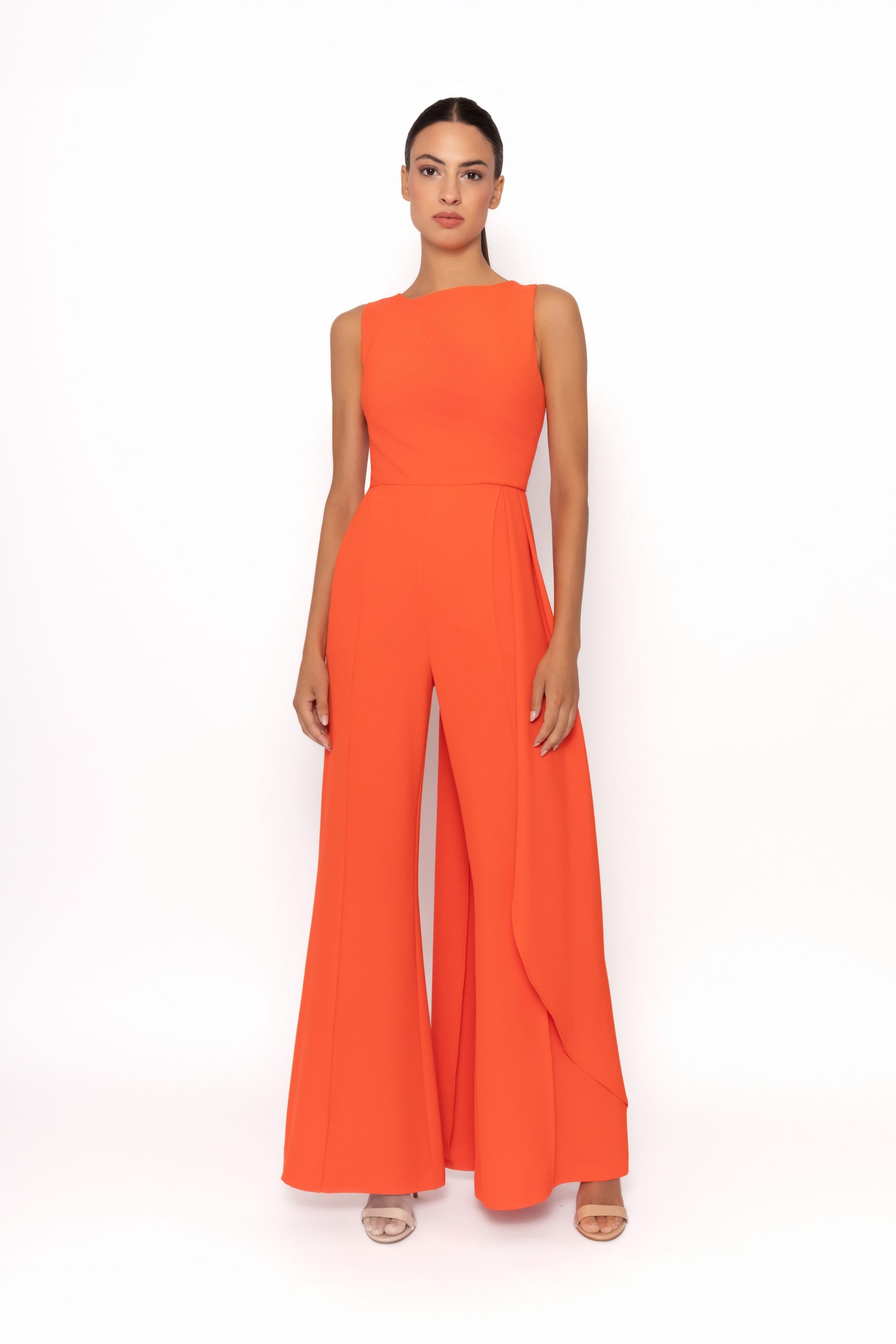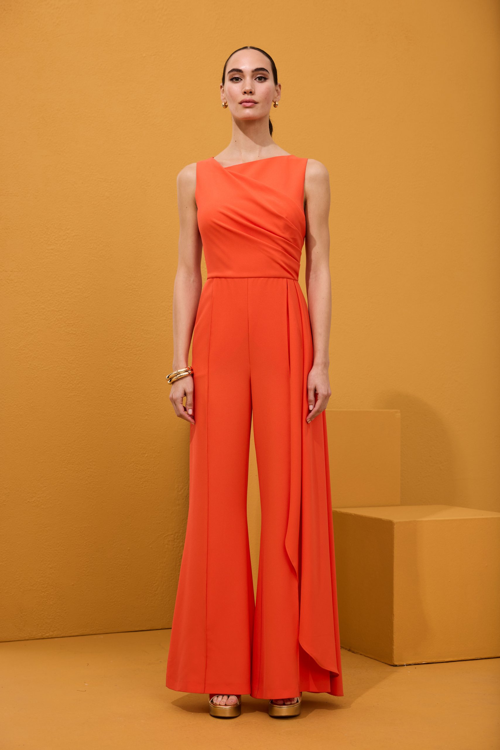 Sensacional mono largo de fiesta confeccionado en crepé Lleva un escote a la caja, una espalda cerrada y de tirantes con un bonito cuerpo drapeado. Los pantalones son rectos y acampanados con una costura en el centro. Tiene una especie de capa en un lateral de la cintura que hace que el modelo resalte por su estilo y sencillez. De la firma Española ARGGIDO.