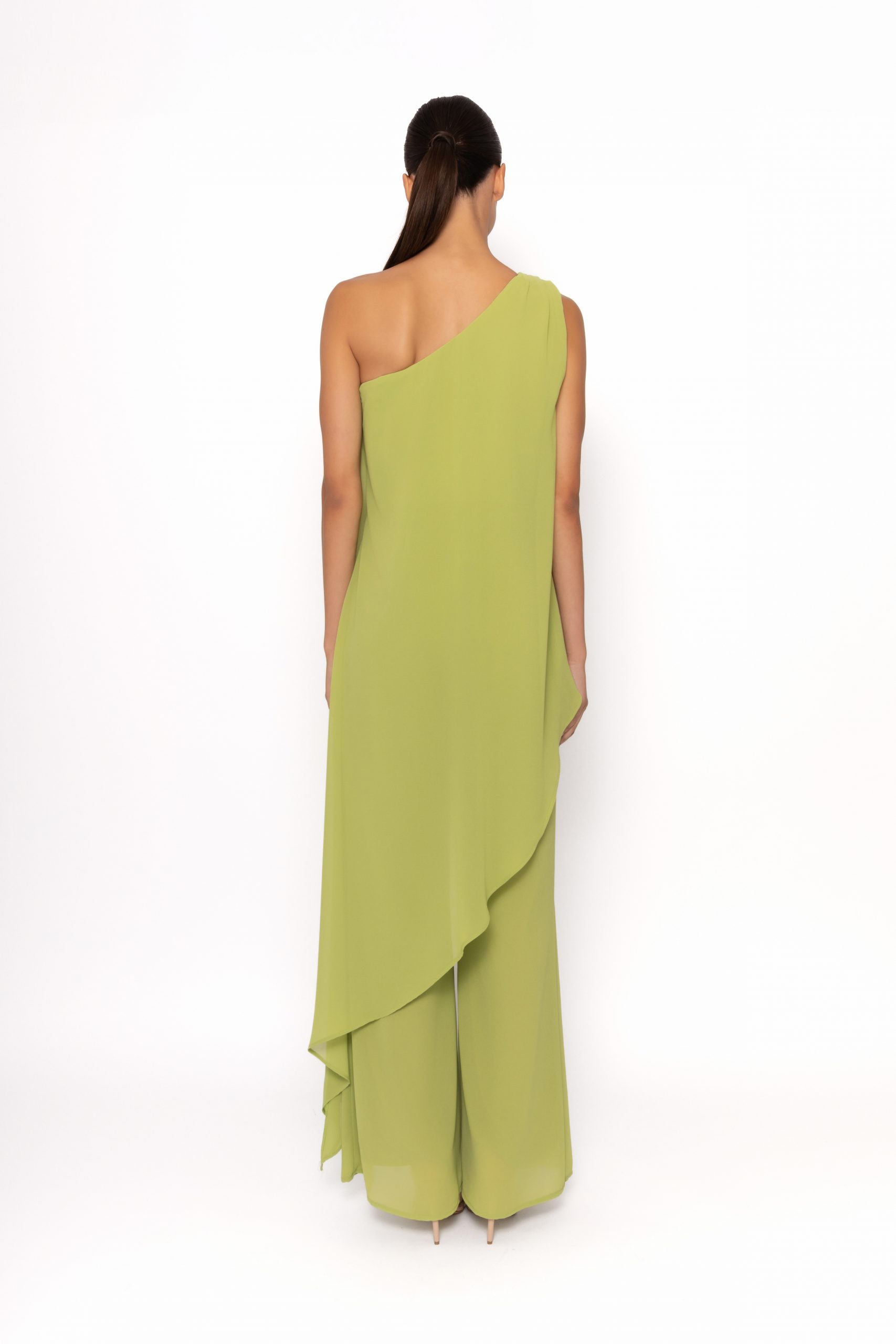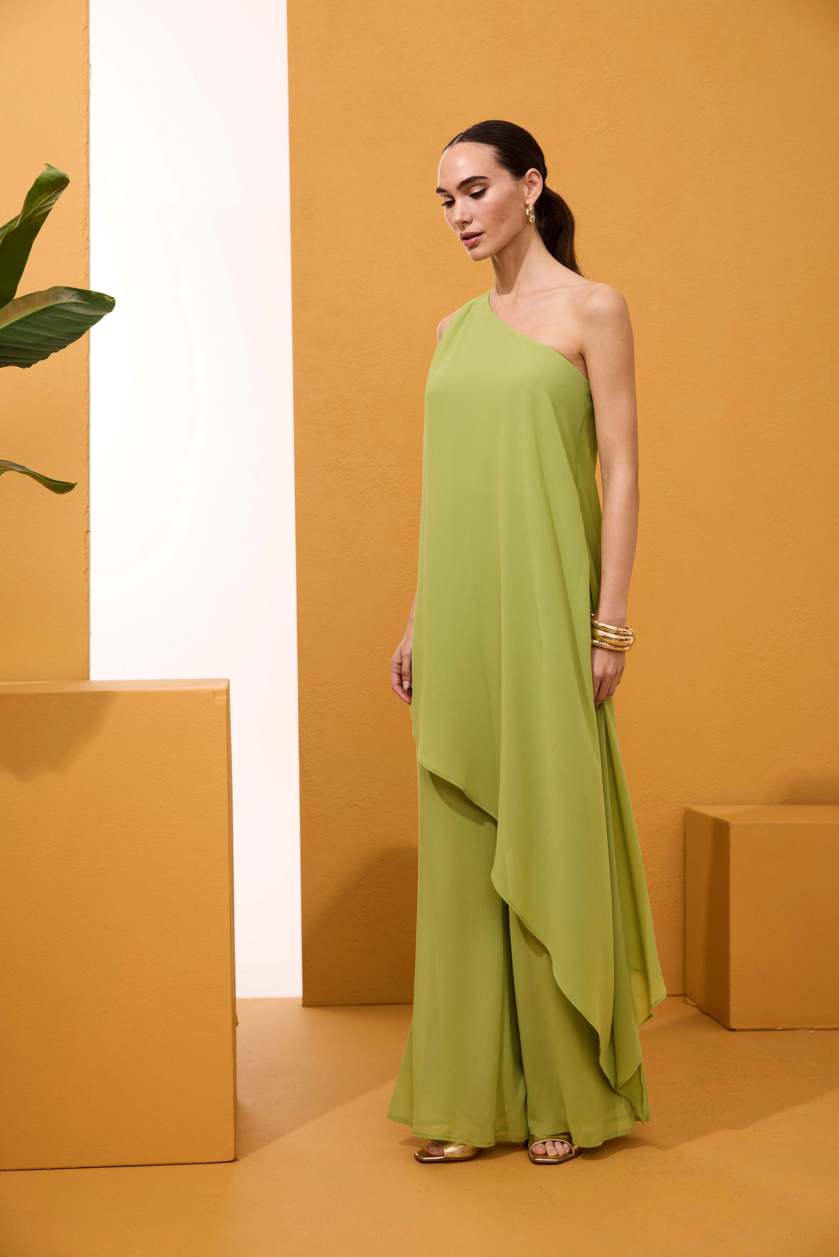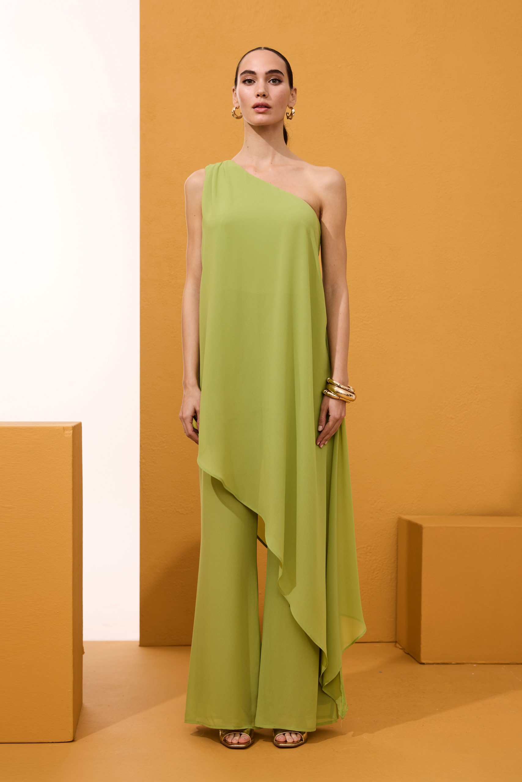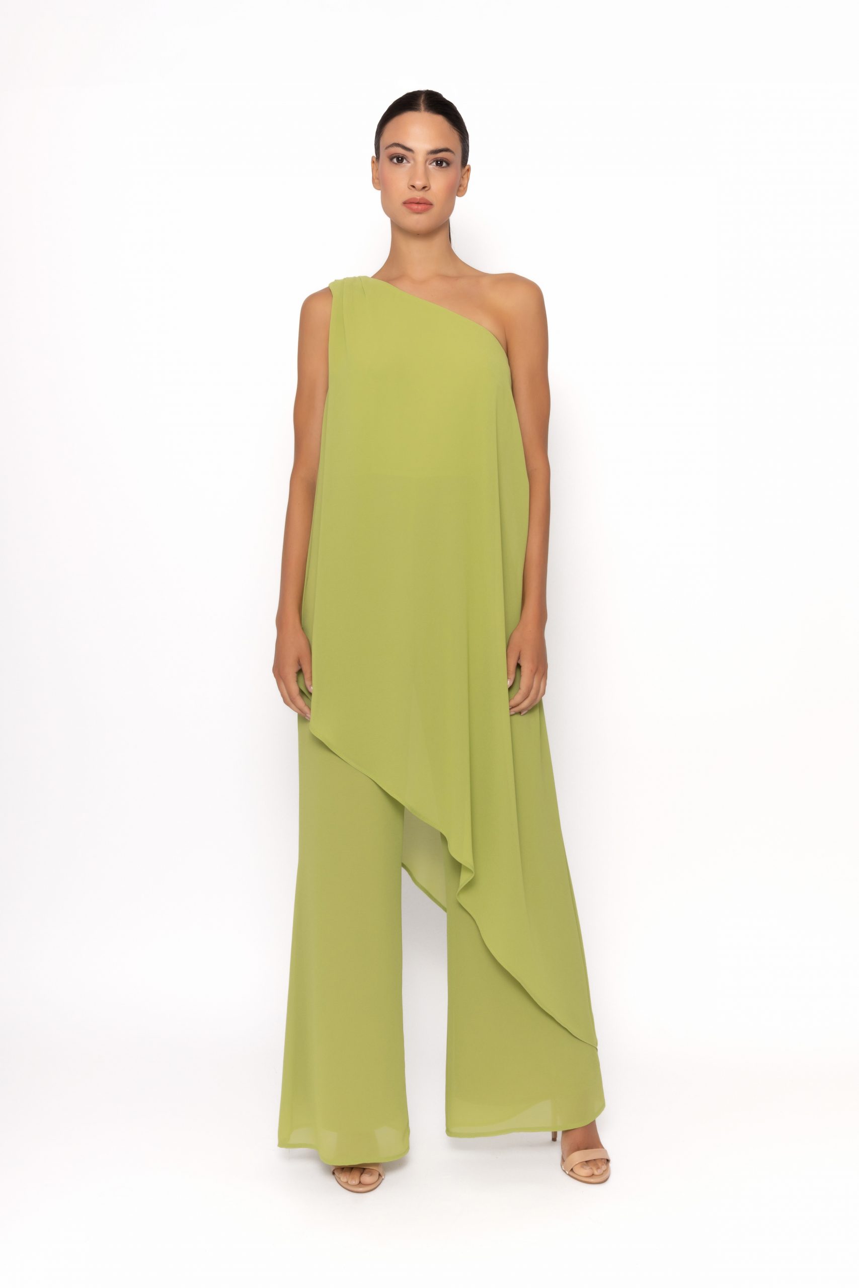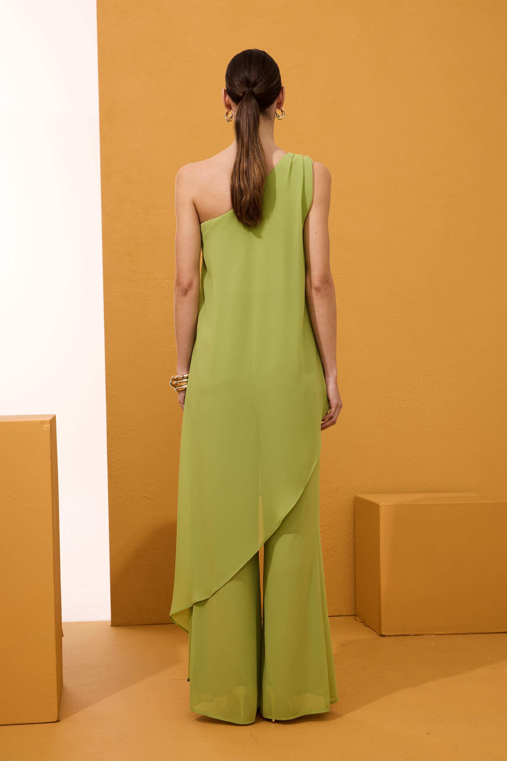 Sensacional mono largo de fiesta confeccionado en gasa. Lleva un escote asimétrico con un solo tirante y una sobre tela encima del mono como un blusón, también asimétrico. El pantalón es de líneas rectas. Un modelo muy estiloso y moderno, a la par que sencillo, ideal para cualquier fiesta o evento. De la firma española de ARGGIDO.