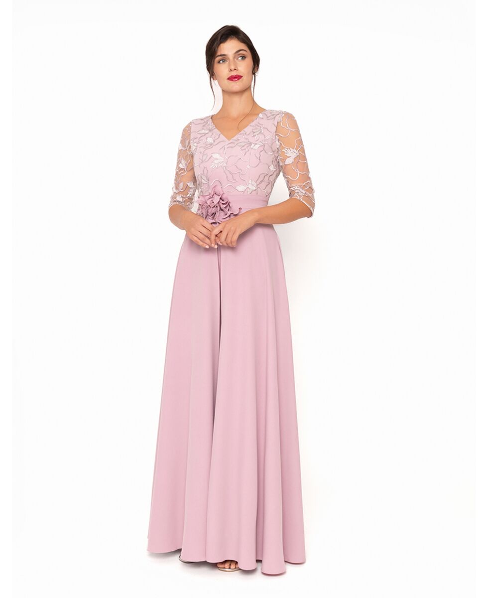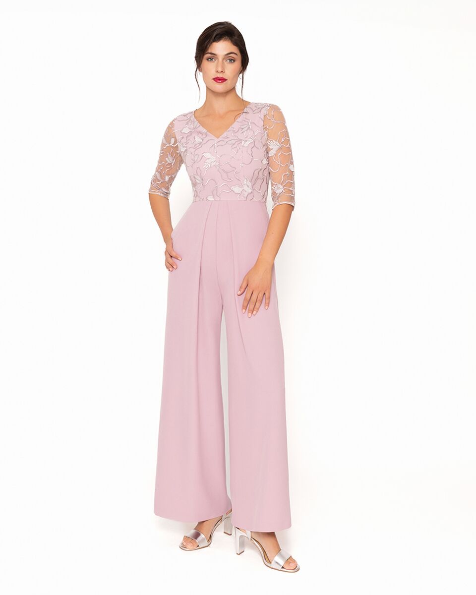 Sensacional mono de fiesta confeccionado en crepé y tul bordado. Su escote de pico, su espalda es cerrada y sus mangas francesas componen este cuerpo de tul bordado. Su pantalón es de pierna ancha con bolsillos con una sobrefalda atada en la cintura. Un modelo lleno de encanto con el que te sorprenderás por su estilo. De la firma Española MONCHO HEREDIA.