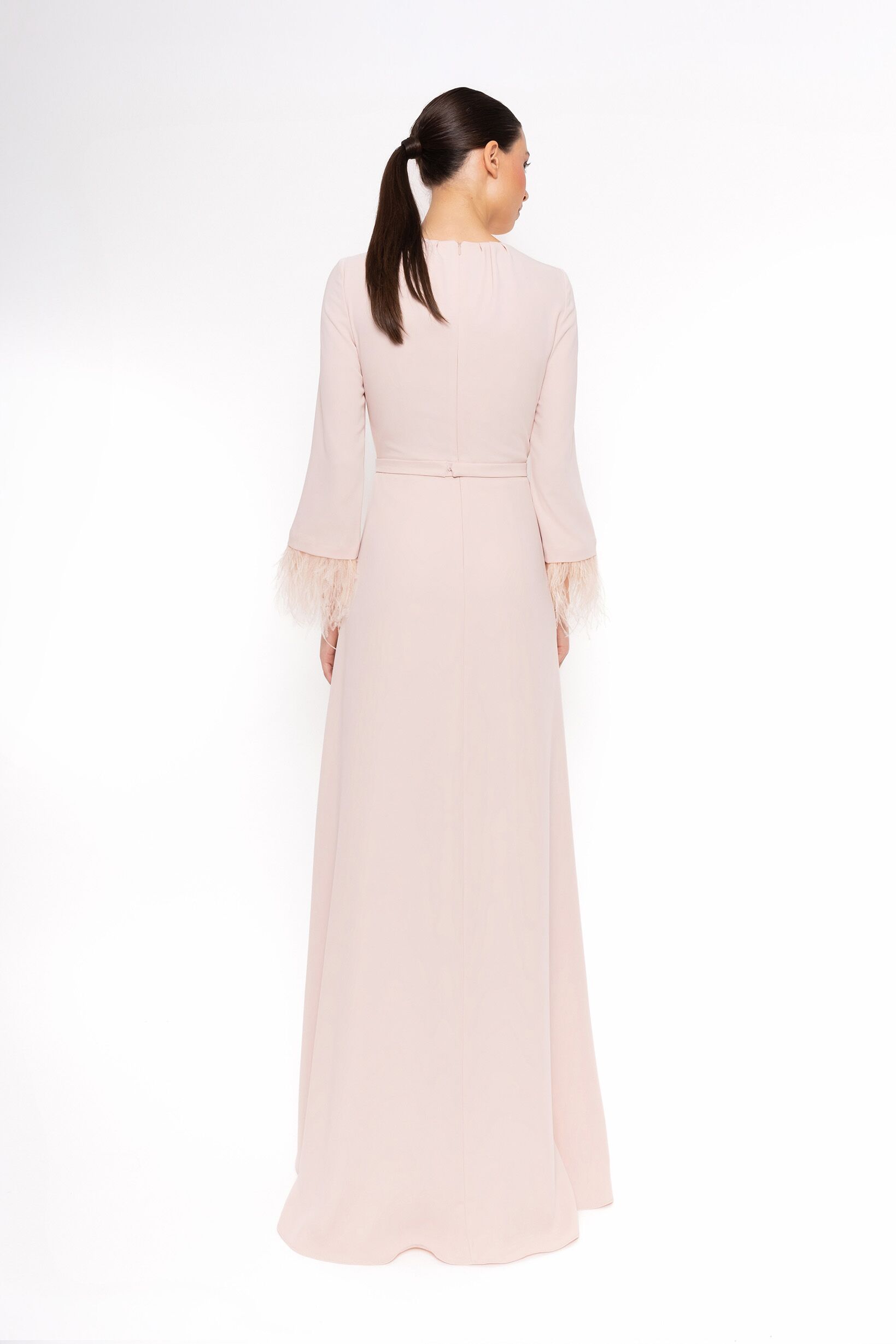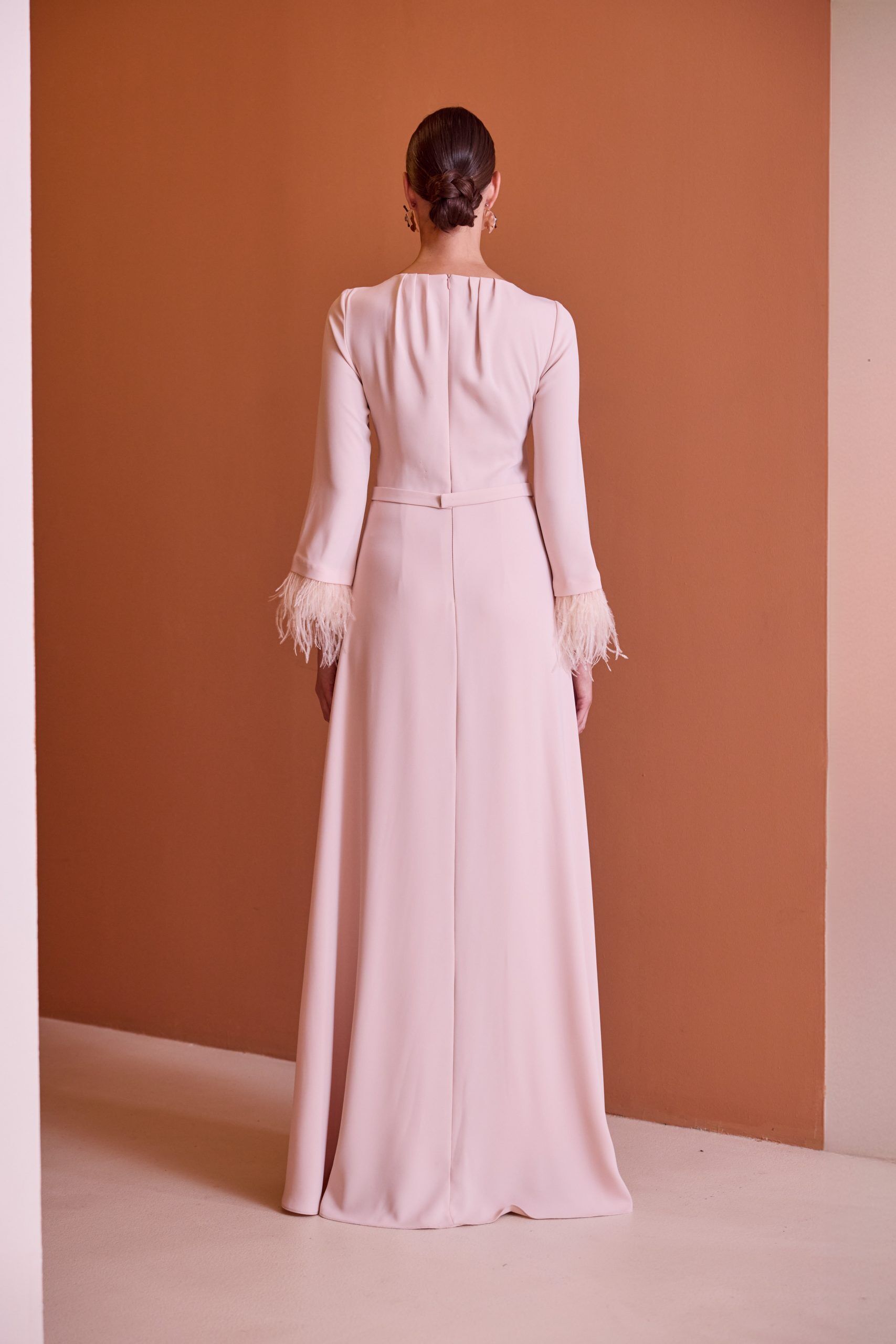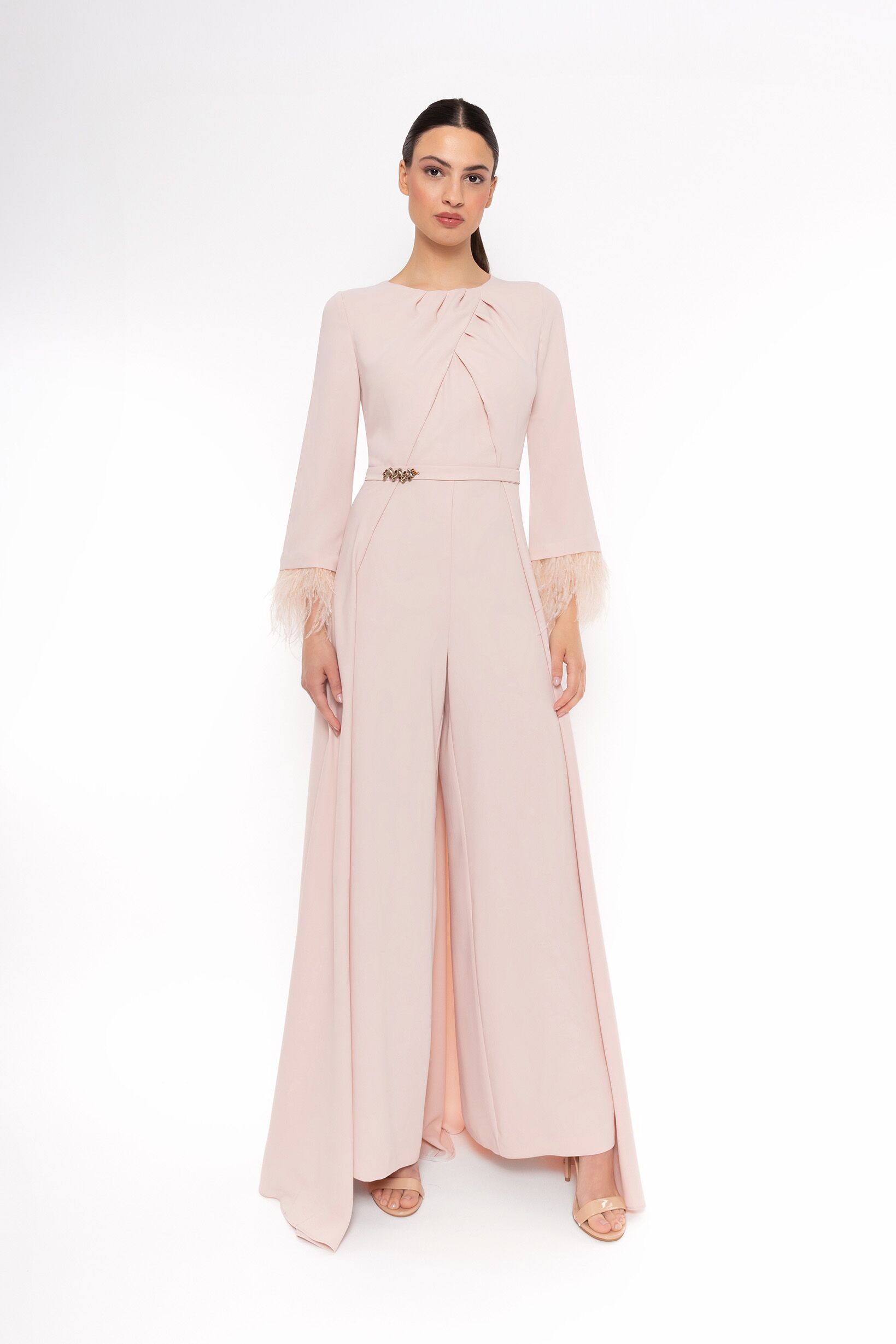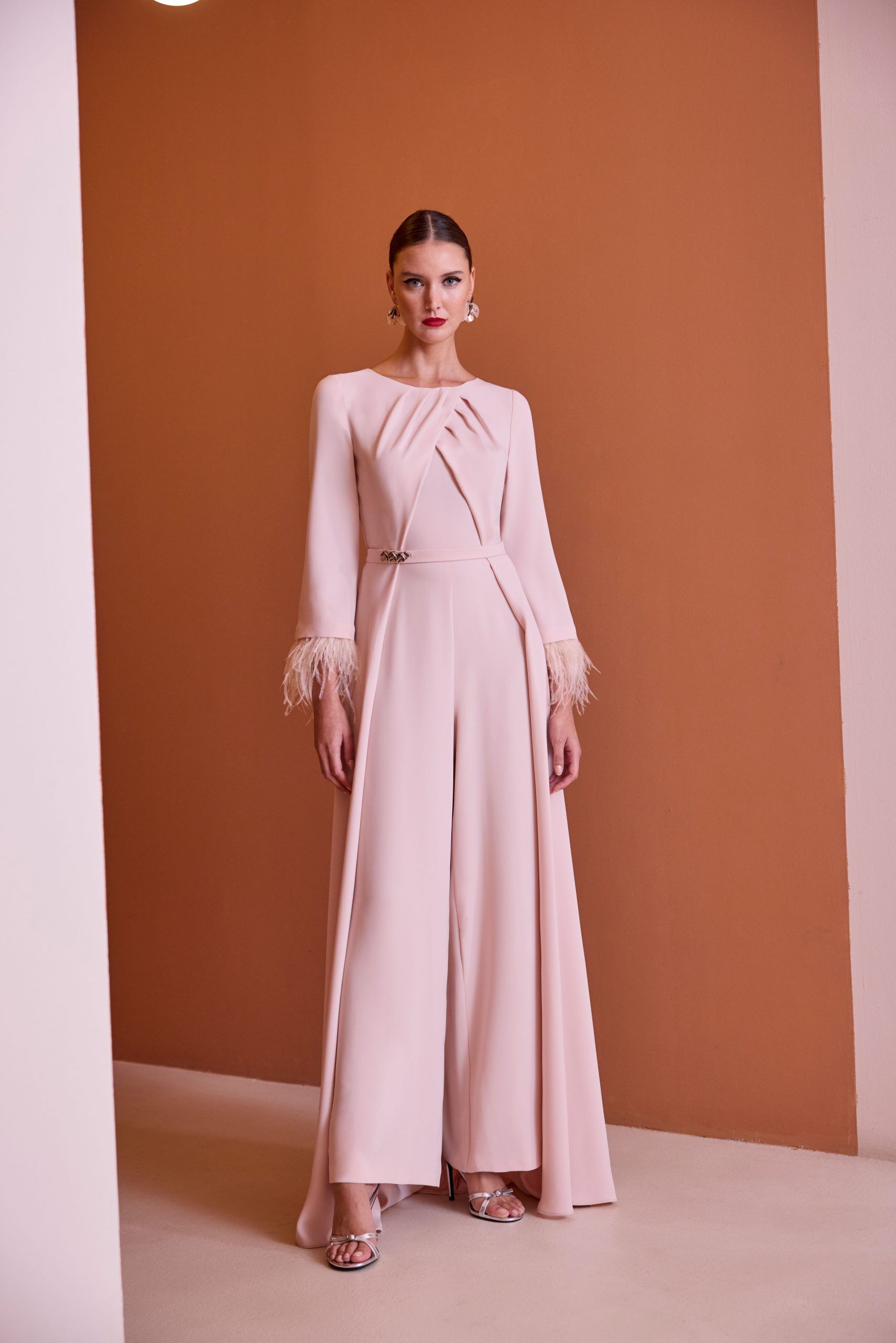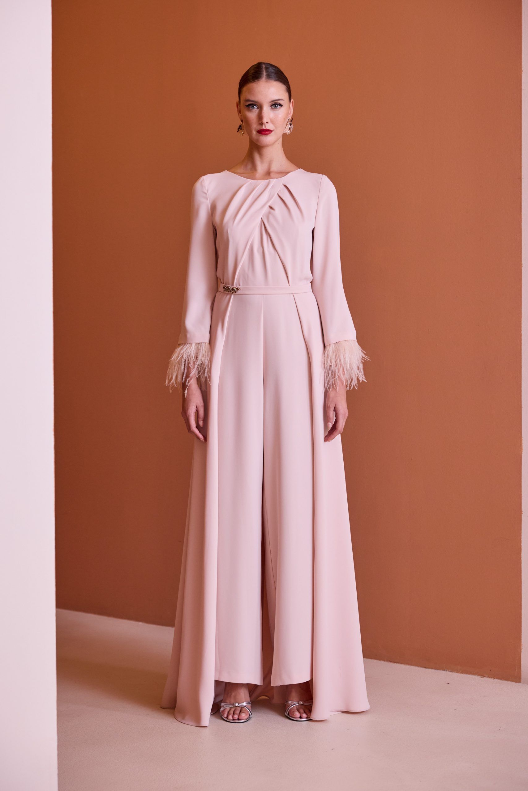 Espectacular mono de madrina de fiesta confeccionado en crepé y pumas. Lleva un escote a la caja, unas mangas francesas con plumas al final que se desmontan y un cuerpo con pliegues en su escote. Unos pantalones rectos con una sobre falta, tipo capa que sale desde la cintura, dejando una parte arrastrando. Un modelo moderno y estiloso con el que te sentirás cómoda en el día de tu evento. De la firma Española CARLA RUIZ.