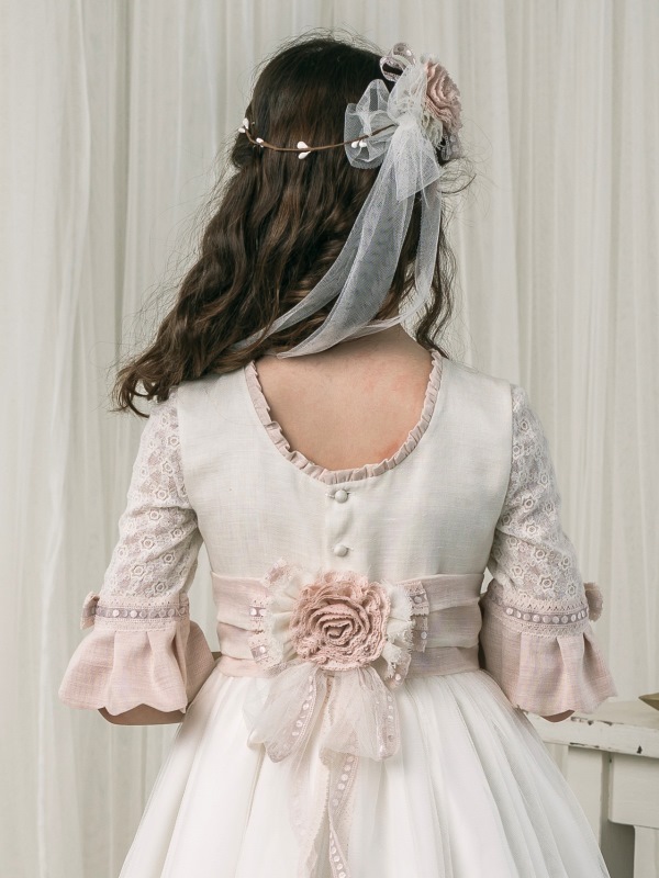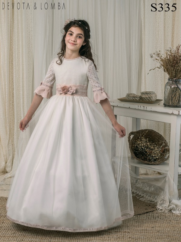 Sensacional vestido de comunión de falda de tul y cuerpo de seda rústica. Le acompaña unas bonitas mangas de batista y un fajín en color rosa con un decorativo lazo. Un modelo de la firma de DEVOTA & LOMBA.