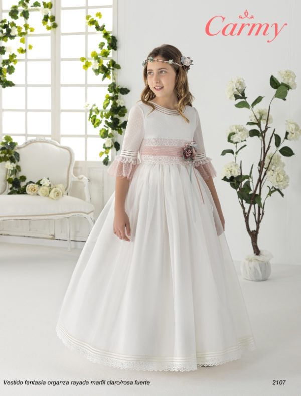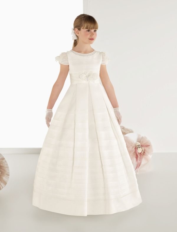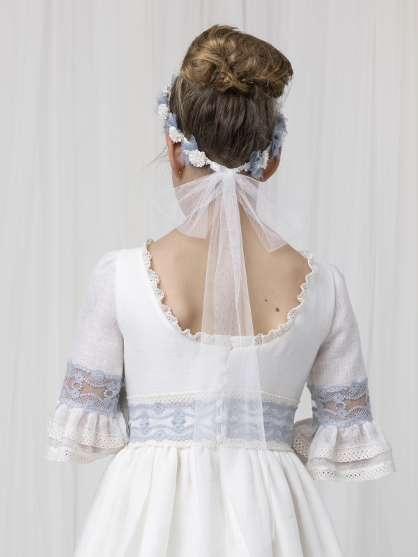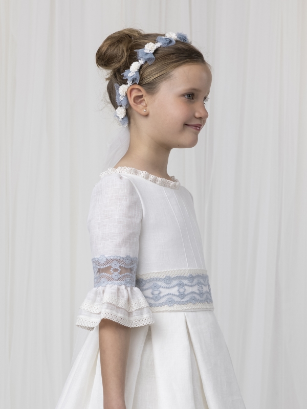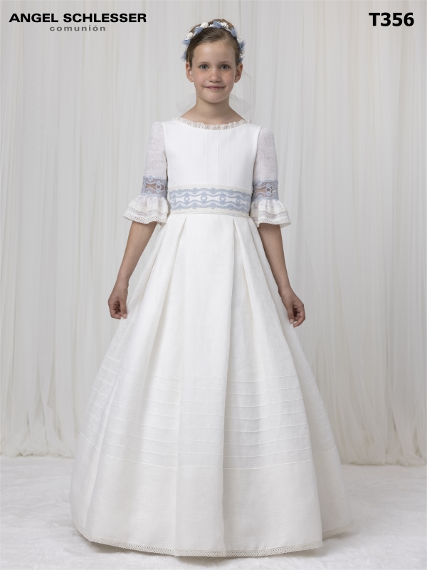 Sensacional vestido de comunión confeccionado en seda bordada. Lleva unas bonitas mangas francesas con dos volantes, el cuello es de barco con un volantito de encaje, en la falda tiene unos cordoncintos bordados muy originales y el fajín es bordado en color azul y beige. Un modelo de líneas clásicas con un toque moderno. De la firma de ANGEL SCHLESSER.