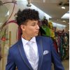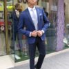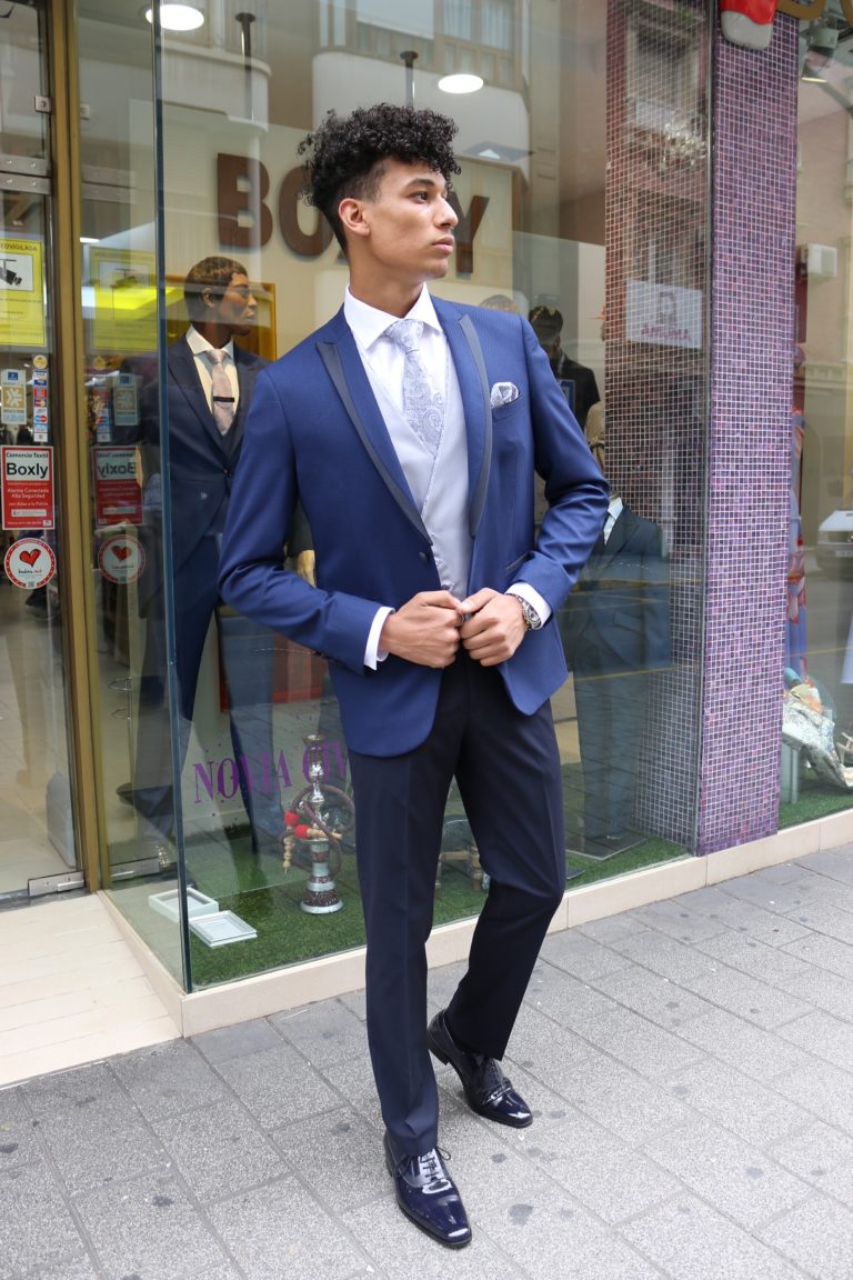 Traje azul noche con solapa a pico y detalle en color negro. Para un invitado con mucha clase y elegancia.
