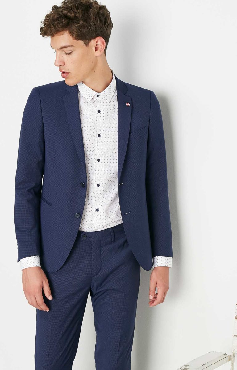 Traje de la firma Florentino de micro cuadro marino, idóneo tanto para eventos y como para trabajo. Amerricana y pantalón de corte italiano. Confección española.