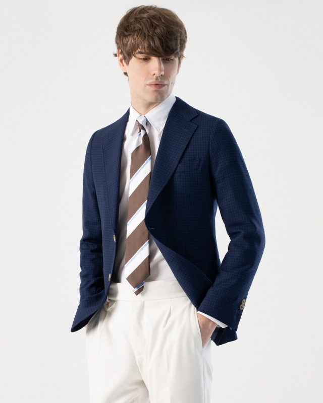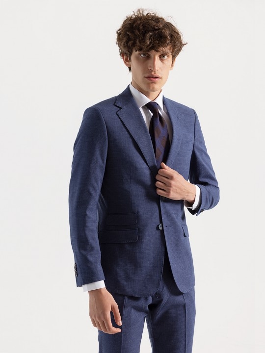 Solapa de muesca, bolsillos con solapa, ribete en pecho, cierre mediante dos botones frontales. Dos aberturas en la espalda, puño de manga con cuatro botones en contraste montados, forro y bolsillos interiores.