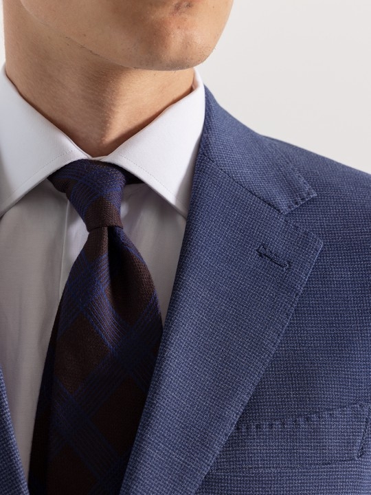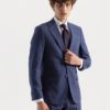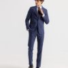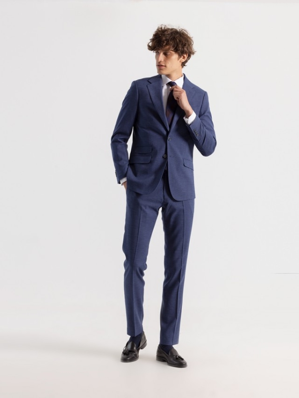 Bonito traje de corte slim fit. Diseño micro de pata de gallo azul cobalto. Americana de solapa de muesca y ribete en pecho; cierre mediante dos botones frontales. Dos aberturas en la espalda, puño de manga con cuatro botones montados, forro y bolsillos interiores. Pantalón con bolsillos frontales y detalle doble vivo en parte trasera. Cierre frontal con cremallera y botón.