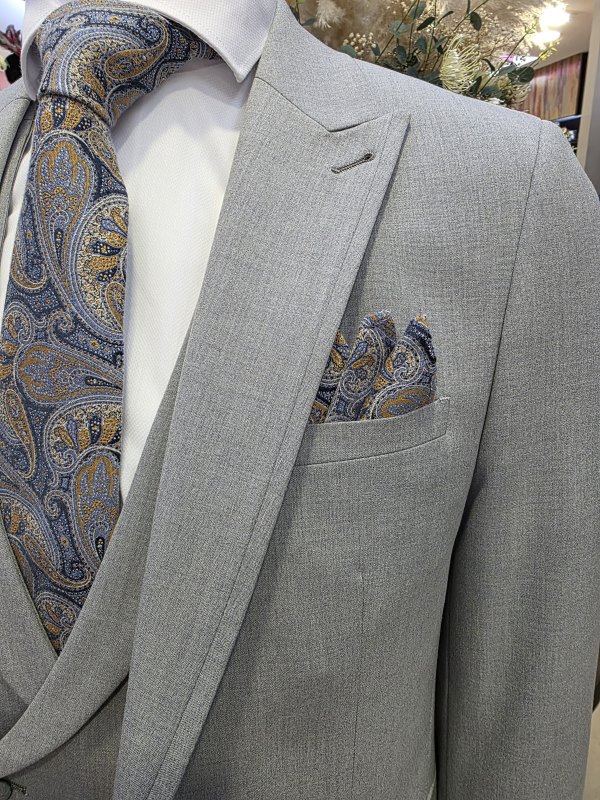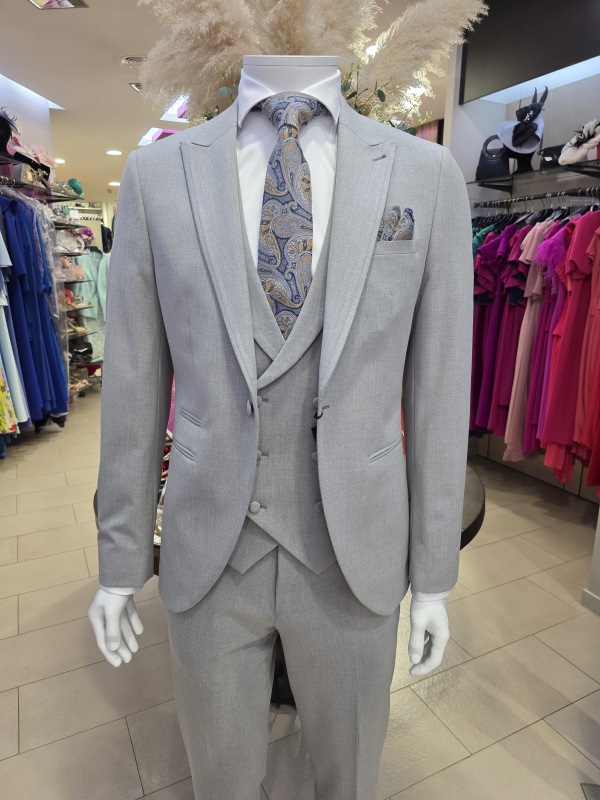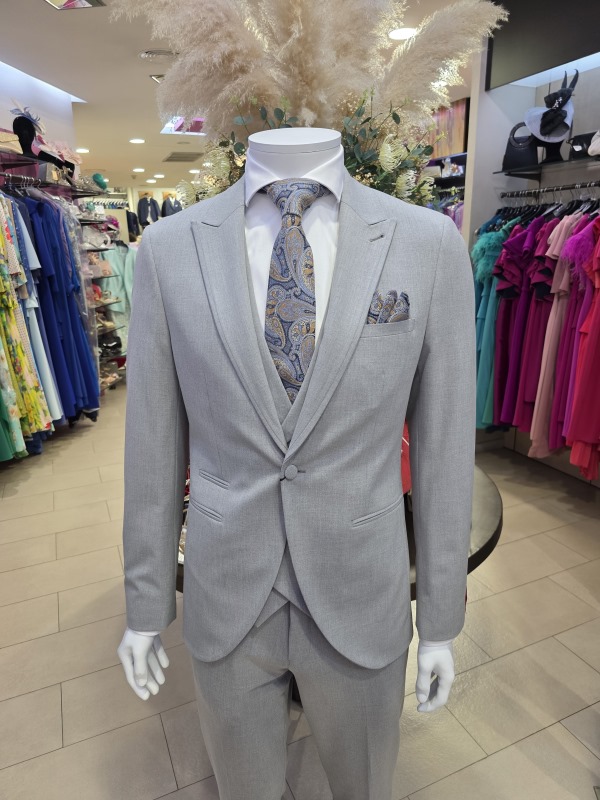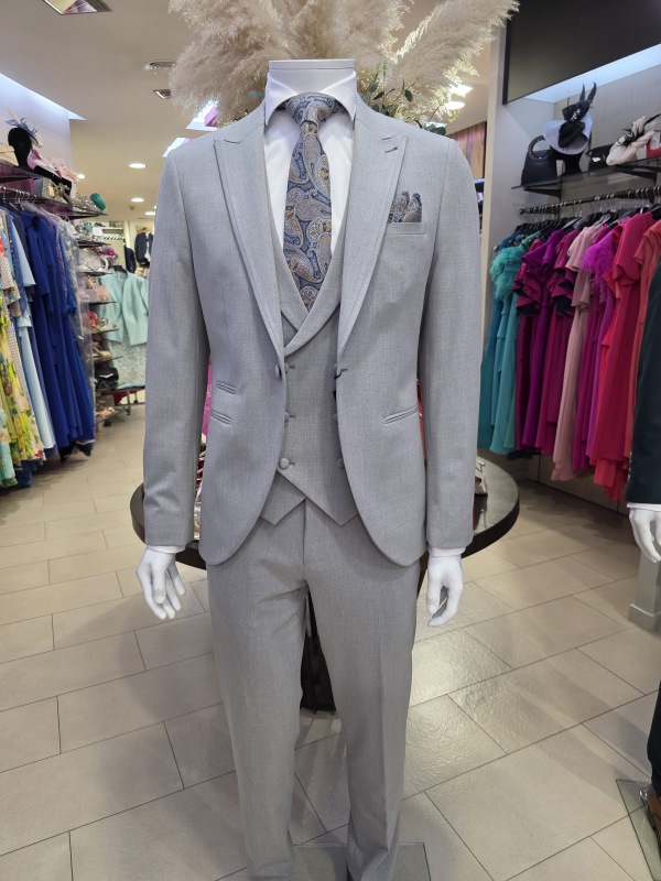 Conjunto de pantalón, chaleco y americana en gris claro. Tejido elástico.