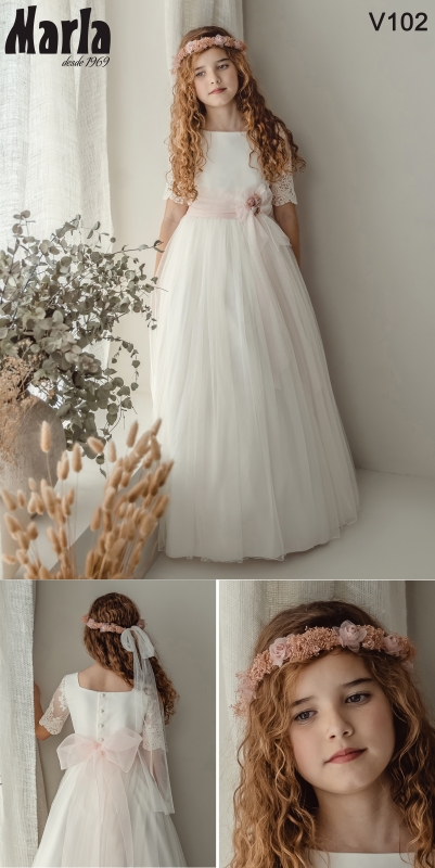 Gracioso vestido de comunión confeccionado de tul. Lleva un escote rectangular que se repite en la espalda, una falda fruncida, unas mangas bordadas con ondas y un fajín en tonos rosas con una flor más subida de tono. Un modelo muy natural y sencillo con el que verás a tu princesa lucir en su gran día. De la firma de MARLA.