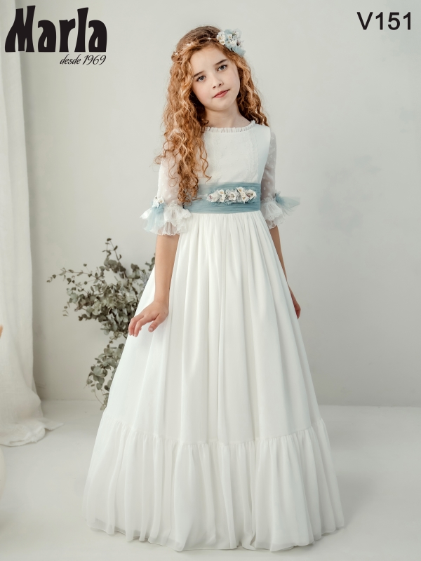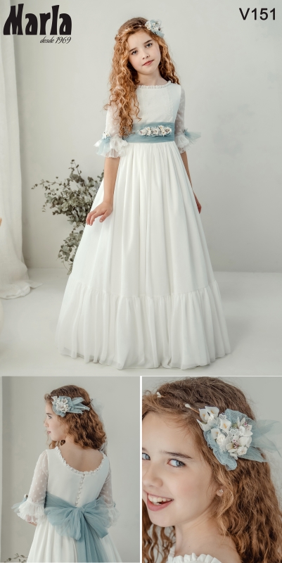 Fantástico vestido de comunión confeccionado en bambula y gasa. Lleva un escote de barco con un volantito, una espalda redonda abotonada, una falda con un volante ancho, unas mangas francesas de gasa con dos volantes al final y un fajín en color verde petróleo. Un modelo sencillo y original por sus combinaciones de tejidos, con el que nuestra princesa brillará en el día de su Primera Comunión. De la firma de MARLA.