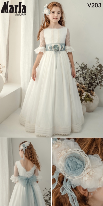 Sensacional vestido de comunión confeccionado en tul bordado. Lleva un escote de cuello de barco con puntilla y una espalda en forma de U abotonada hasta la cintura; el cuerpo lleva un bordado central de encaje y unas mangas francesas con dos volantes; su falda es de tul bordado con cuatro jaretas en su terminación y su fajín es de tul en color azul. Un modelo entre clásico y moderno con el que nuestra princesa brillará en su Primera Comunión. De la firma de MARLA.