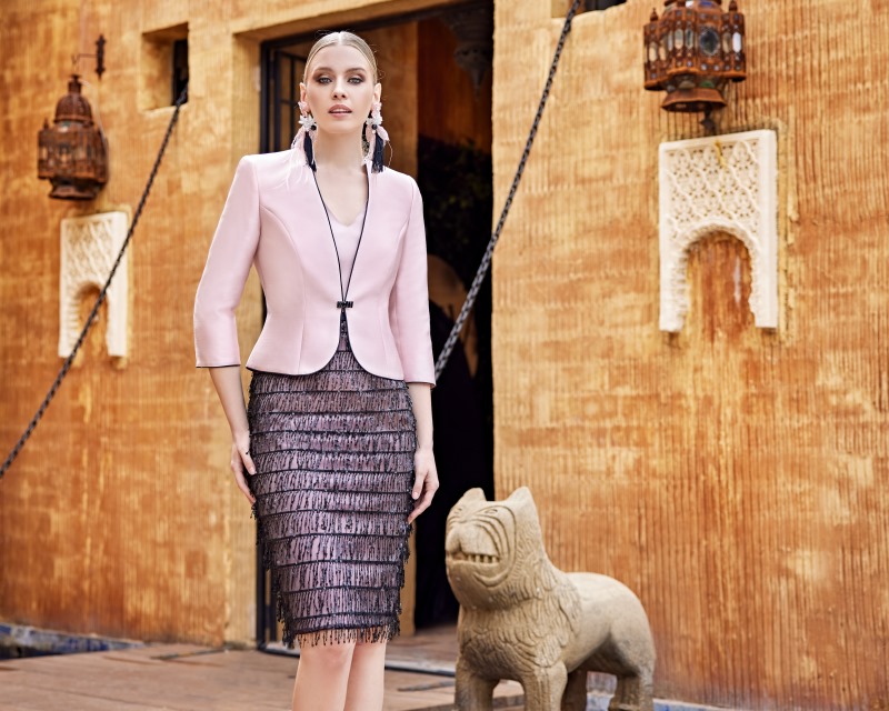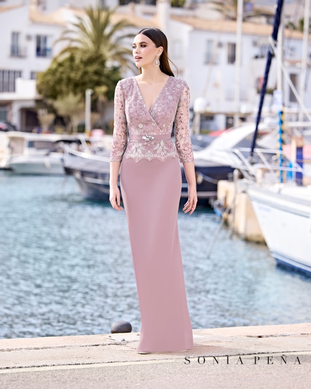 Elegante vestido largo en crepe con el cuerpo bordado. Lleva un bonito escote de pico y una fantástica manga transparente. Un modelo ideal para una madrina con estilo propio. De la firma de SONIA PEÑA.