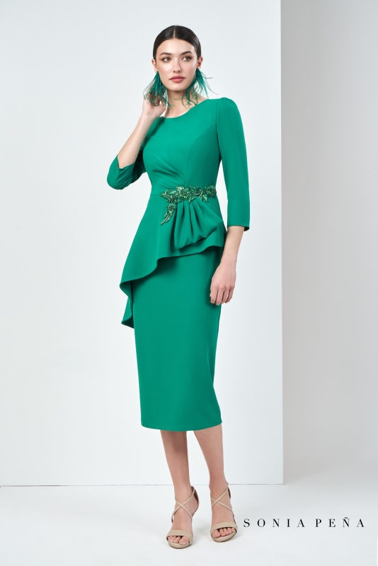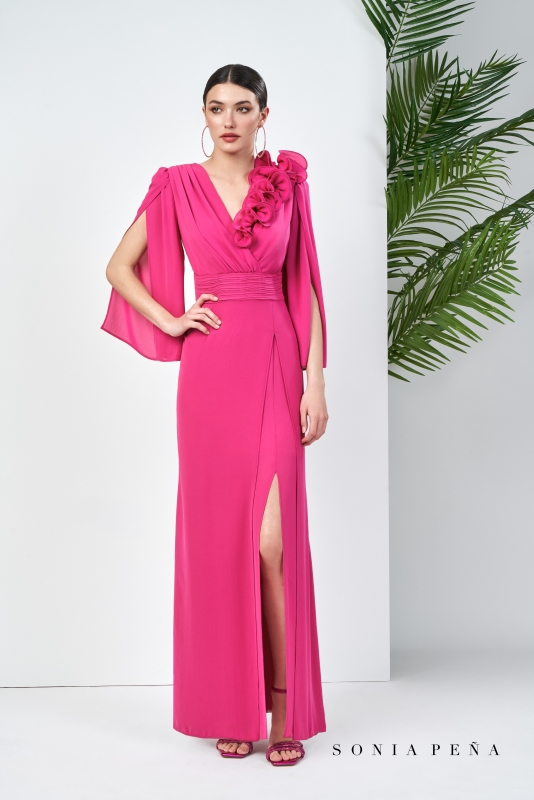 Elegante vestido largo en crepe con el cuerpo bordado. Lleva un bonito escote de pico y una fantástica manga transparente. Un modelo ideal para una madrina con estilo propio. De la firma de SONIA PEÑA.