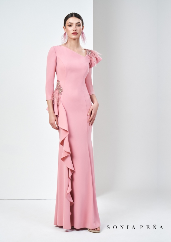 Sensacional vestido largo de madrina confeccionado en crepé. Lleva un escote y unas mangas francesas asimétricas con un aplique de lentejuelas y plumas en el hombro y en un lateral de la cadera. En la falda lleva una bonita chorrera de volantes que caen hacia el final del vestido. Un modelo lleno de encanto y elegancia para aquella madrina que le guste ir moderna y con estilo. De la firma de SONIA PEÑA.